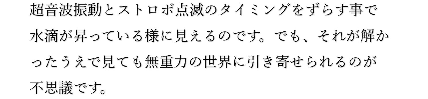 A. 水滴が無重力に見えるのは、ストロボ点滅を水滴の落ちる速度に合わせることで、上がっていくように錯覚を起こす原理を利用しているからです。実際には水滴が落ちているのに、視覚的には水滴が上昇しているように見えるのです。
