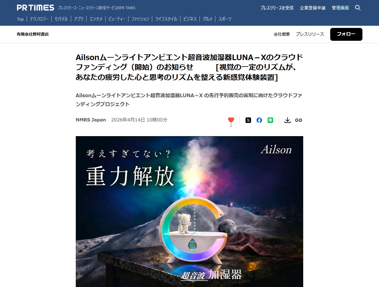 2026/04/14 17:14【プレスリリース公開】Ailson 超音波加湿器「ルナ」 日本初上陸のお知らせを PR TIMESにて公開しました。PR TIMES➡https://prtimes.jp/main/html/rd/p/000000006.000107128.html現在CAMPFIREにてクラファン中 最大45%OFFは残りわずかです。CAMPFIRE➡https://camp-fire.jp/projects/915888/view?list=projects_fresh もっと見る