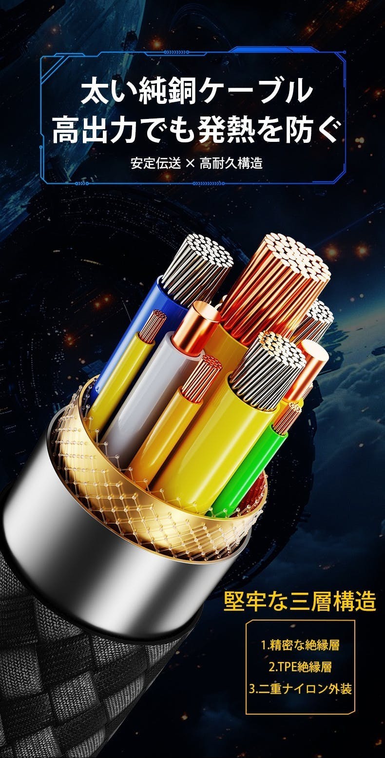 太い純銅ケーブルを採用しているため、電力伝達効率が高く発熱を抑えられる上、長期間の使用でも劣化しにくく、常に安定した充電性能を発揮します。