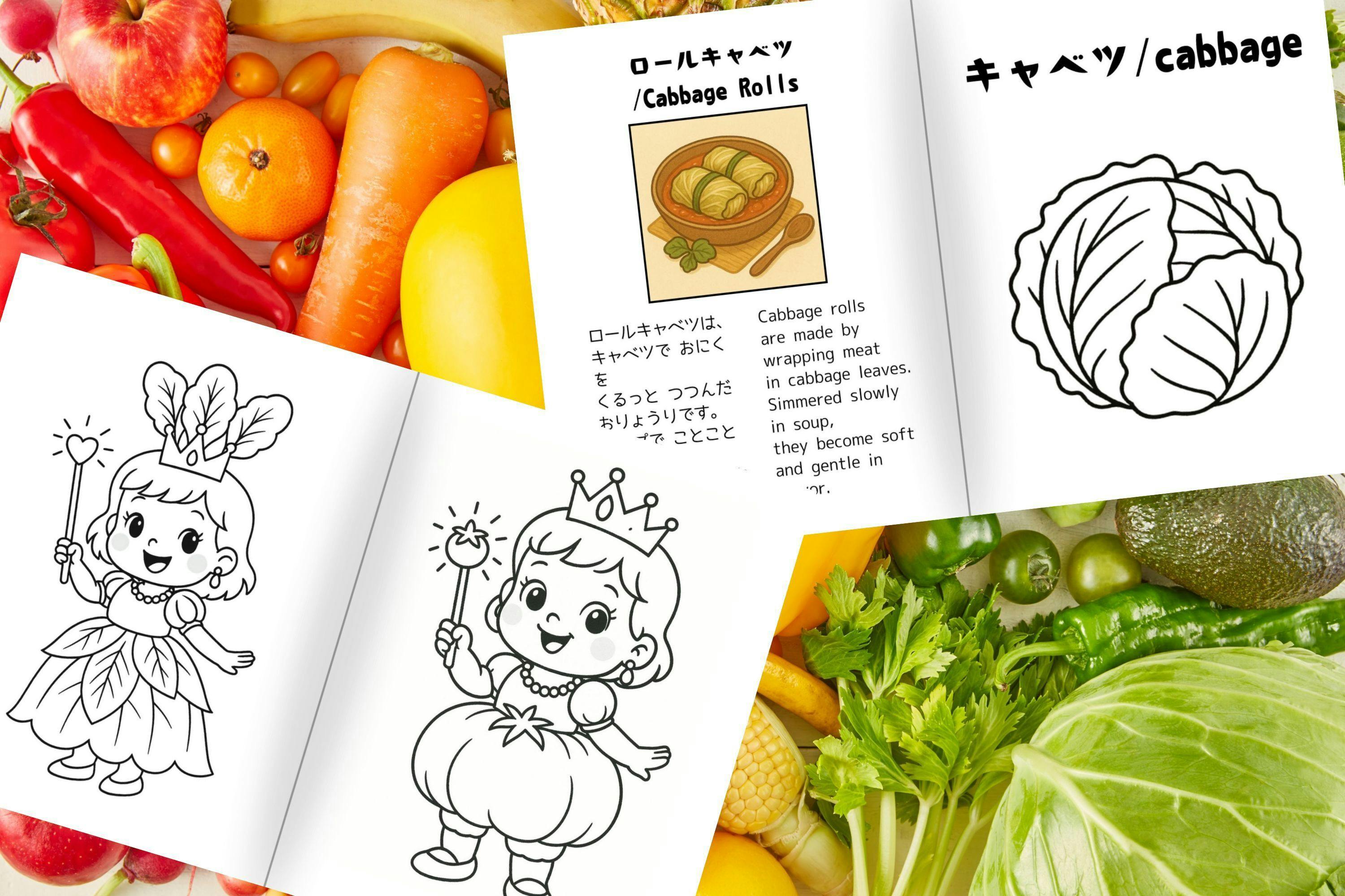 やさいのぬりえでは、ぬりえと一緒に、その野菜を使ったお料理も紹介しています。