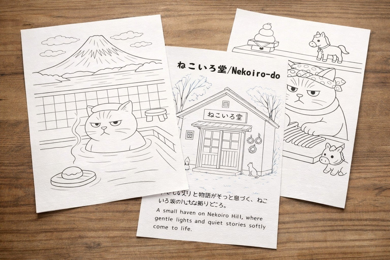 ねこいろ堂のぬりえは、子どもだけのものではなく、大人も一緒に、ゆっくり楽しめる内容になっています。