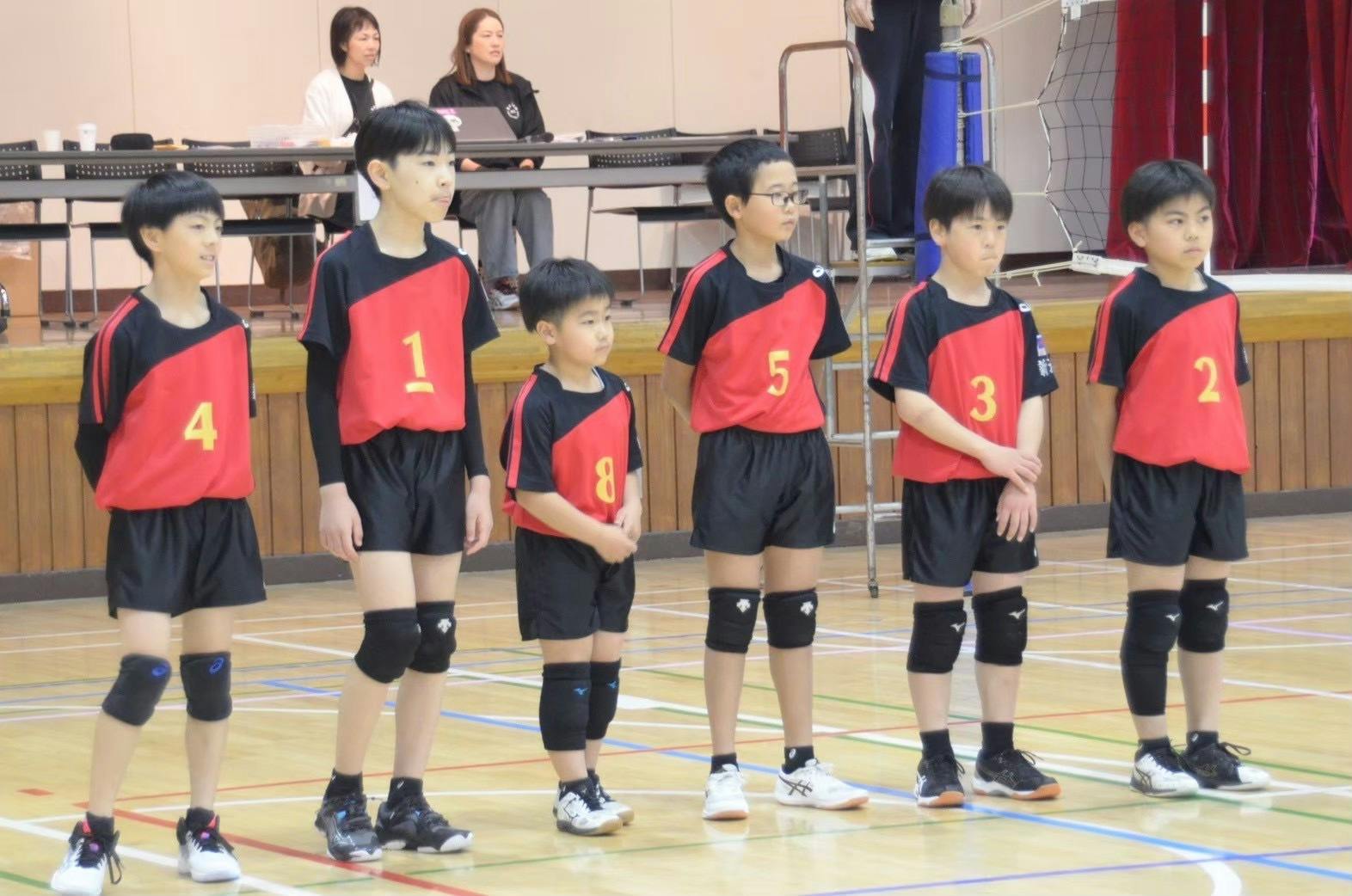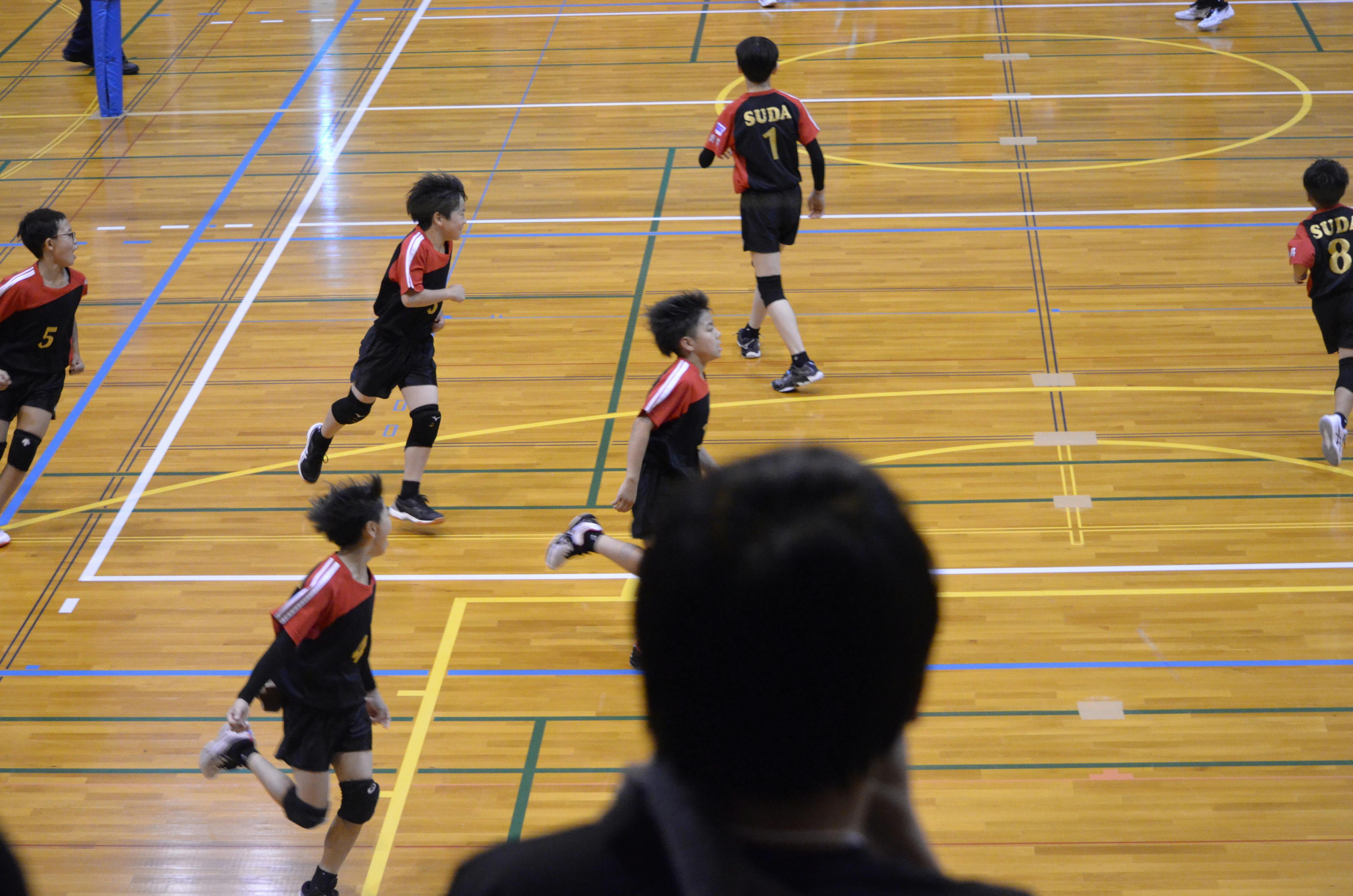 6年生4名、5年生1名...もう1人のメンバーは小さな2年生。6年生の強烈なスパイクに立ち向かいます!サーブで攻めます!5・6年生に助けてもらいながら、たくさん経験を積んだ1年でした。他のちびーず(←2年生・3年生の愛称)も、大きな声でコートを盛り上げます!フローターサーブも力強くなってきました!