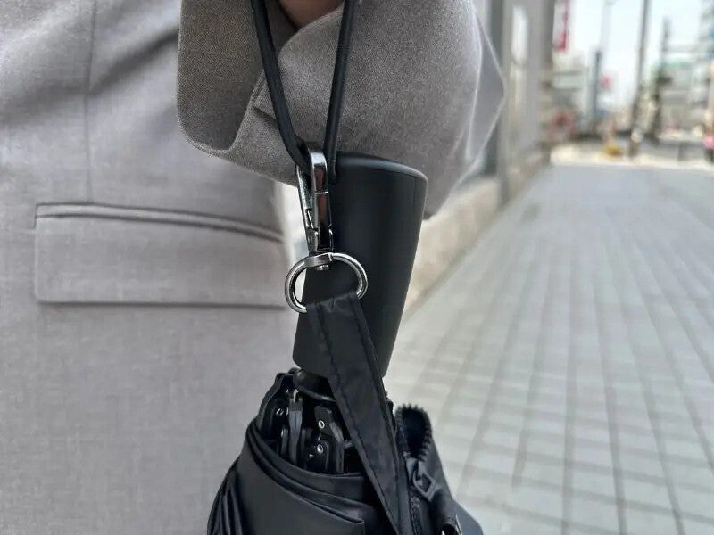 傘カバー側にフックがついているので、フックでかけたり、ストラップに巻き付けてぶら下げることが可能です。