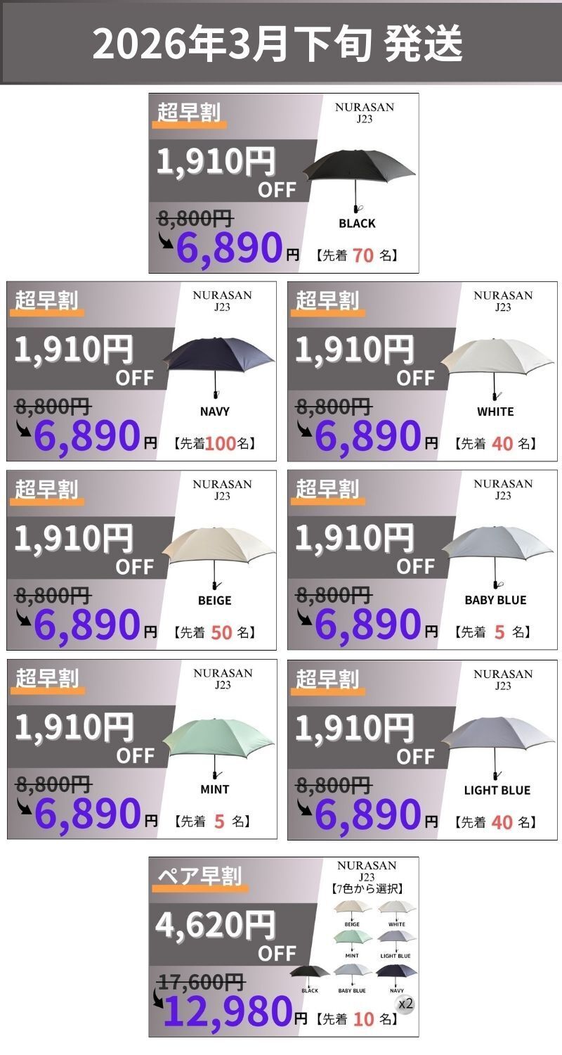 2026/03/20 12:00支援者のみなさまいつもプロジェクトの応援ありがとうございます。本日12時より雨×暑×風対応の120㎝ワイドな傘【NURASAN-J27Ws】の第3弾限定販売がはじまりました!累計1,280万円、のべ1,300名を超える方々にご支援いただいたシリーズ最強の晴雨兼用傘!年々暑くなる夏、急に降り始めるゲリラ豪雨に突風。あなたも悩まされていませんか!?そんな場面も“この1本”で解決。職場や車に予備として、バッグに忍ばせていざというときに、メインの傘としてももちろんお使いいただける1本。NURASANシリーズをご愛用している方の声もご紹介しますのでぜひチェックしてください!4色展開でお待ちしております。▶【販売会場はこちら】>>レビューコメントはこちら もっと見る【NURASAN-J23】商品の発送が完了しました