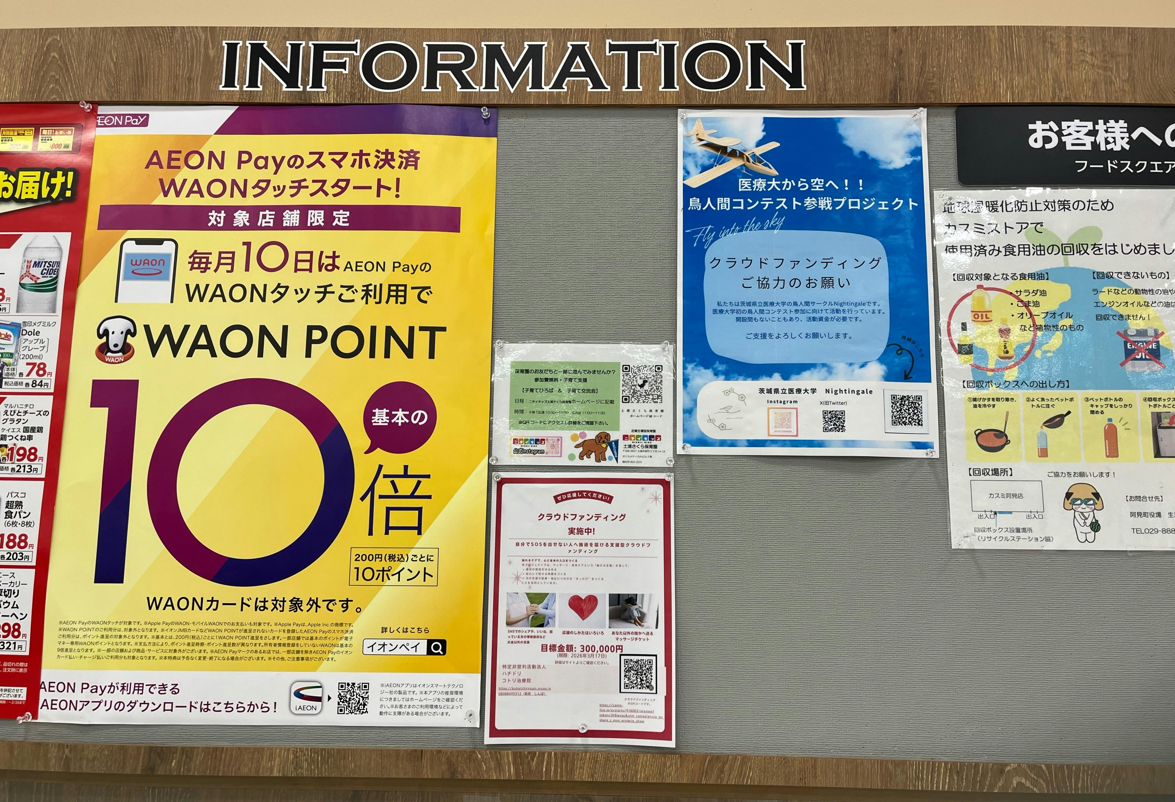 阿見町中郷のカスミフードスクエアさんで、クラウドファンディングのチラシを掲示していただくことができました。お心遣いに感謝いたします。