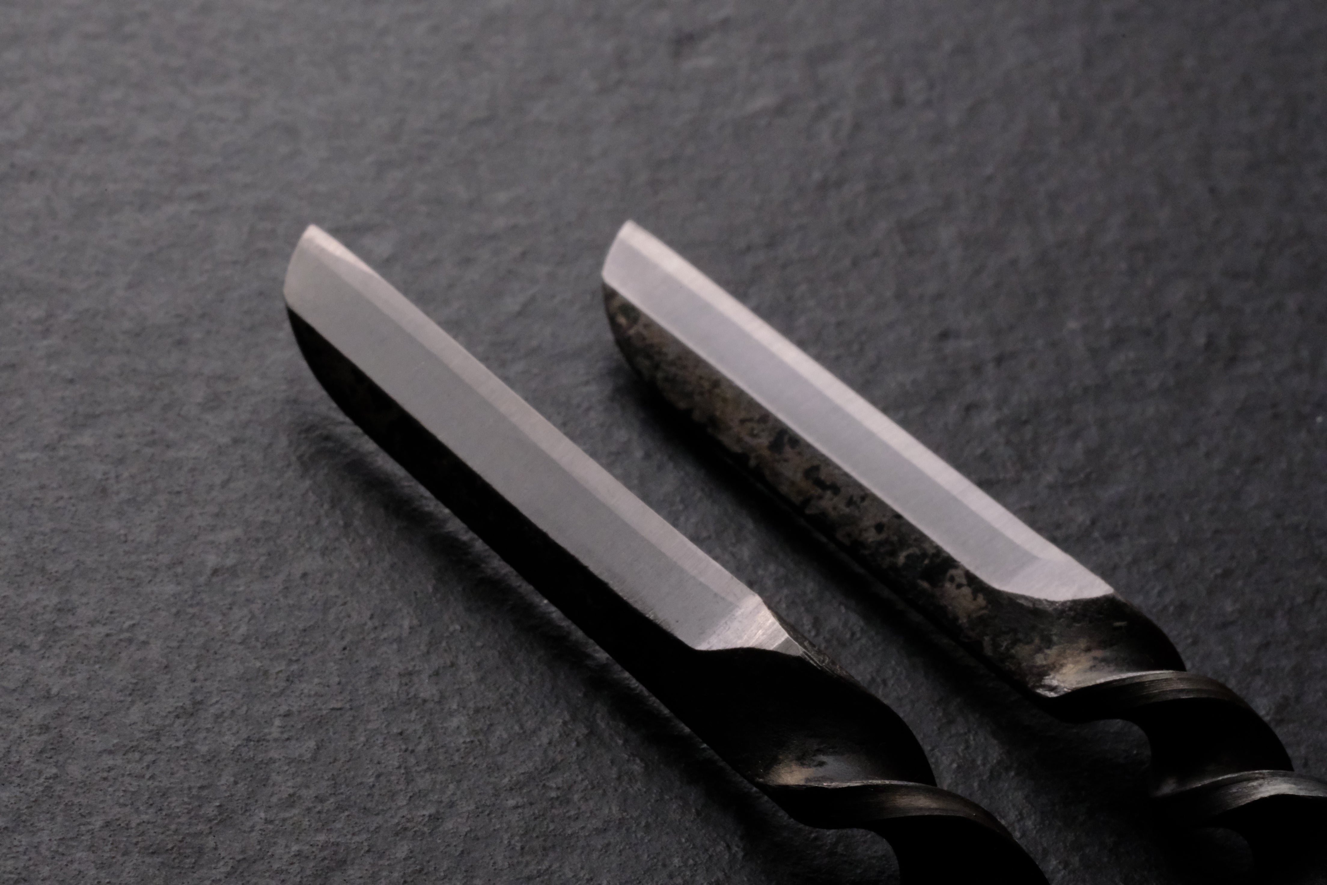 ナイフの固有の黒い表面は、焼き入れなど熱処理の工程において形成される酸化膜です。この膜に覆われた部分は錆びにくくなるというメリットがあります。そして表面が同じナイフは存在せず、それぞれが唯一無二のものとなるのです。