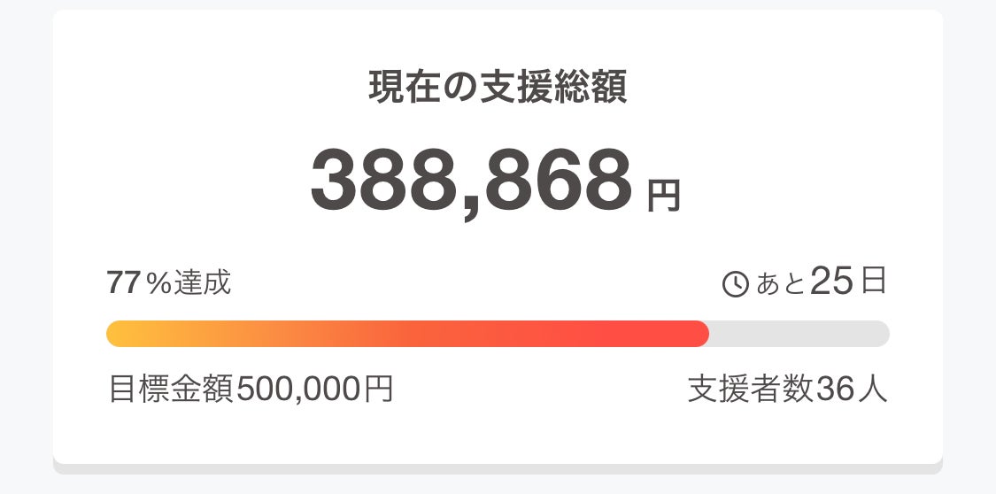 ご支援くださった皆様、ありがとうございます!開始から24時間経っていませんが、既に77%達成しました!取り急ぎ、ご報告です!