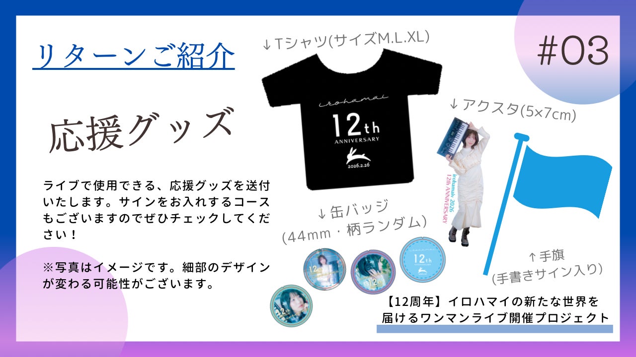 2026.2.26のイベントに参加できるコースや、12周年をお祝いできるお花の協賛コース、12周年を記念したグッズや新曲のMV制作にご協力いただけるコースなどをご用意しております。