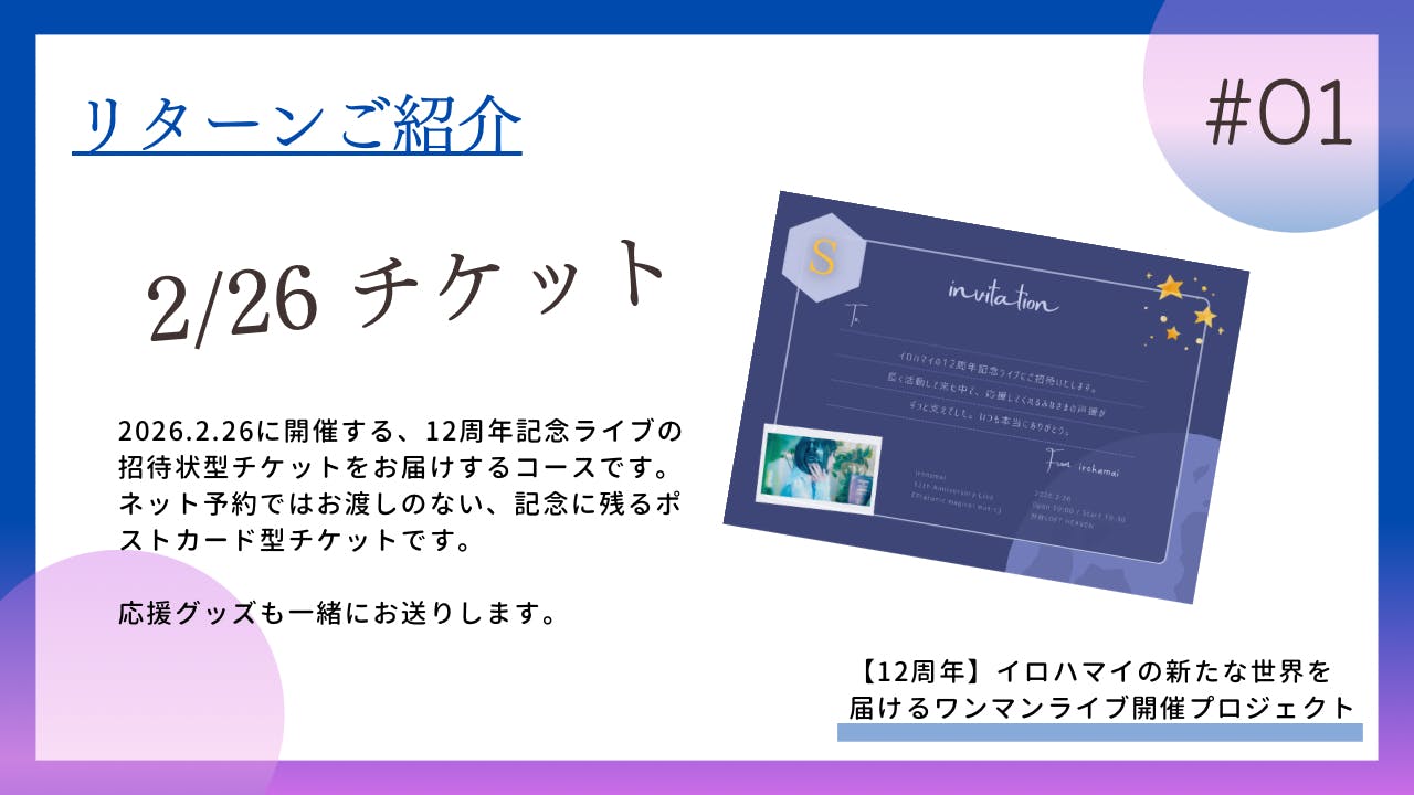 2026.2.26のイベントに参加できるコースや、12周年をお祝いできるお花の協賛コース、12周年を記念したグッズや新曲のMV制作にご協力いただけるコースなどをご用意しております。