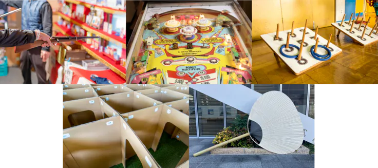 打ち落として遊ぶ射的。