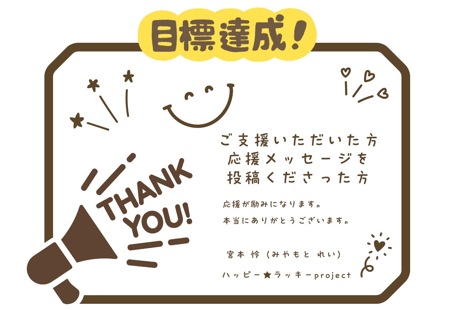 2026/01/15 07:16おかげさまで目標を達成することができましたご支援、本当にありがとうございます。こんなに早く達成できるとは思っておらず、「応援の輪」が広がっていくことを感じる1週間でした。今までインスタ等で怜を知っていてくれていた方、怜が幼少期から今日までお世話になった方々、母が個人的にお世話になっている方からのご支援が多く、感謝の気持ちでいっぱいです。直接のご支援だけでなく、応援メッセージを投稿いただいた方やSNS等でシェアいただいた方にも、心よりお礼申し上げます。応援メッセージへの感謝チャレンジスタート前に応援メッセージ募集期間を設けました。今回ははじめてのチャレンジで、1歩踏み出す事にだいぶ躊躇していましたが、たくさんの方に応援メッセージをいただき、とても心強く、無事チャレンジすることができました。ネクストゴールの設定についてせっかく、早期に目標達成できましたので、ネクストゴールを設定したいと考えています。とはいえ、金額を大きく増やすことは考えておらず、「応援の輪」を広げられるように考えていきます。金額よりも「応援の輪」を広げることを目標にしたいと思っています。近日中に、ネクストゴール設定しますので、是非シェアなどご協力いただけたら嬉しいです。ハッピー★ラッキーproject もっと見る