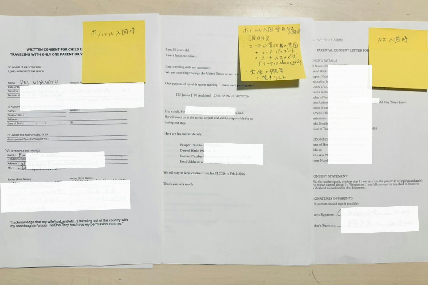 その後は、両親の同意書とパスポート、帯同コーチの身分や滞在先を記載した書類を持参。