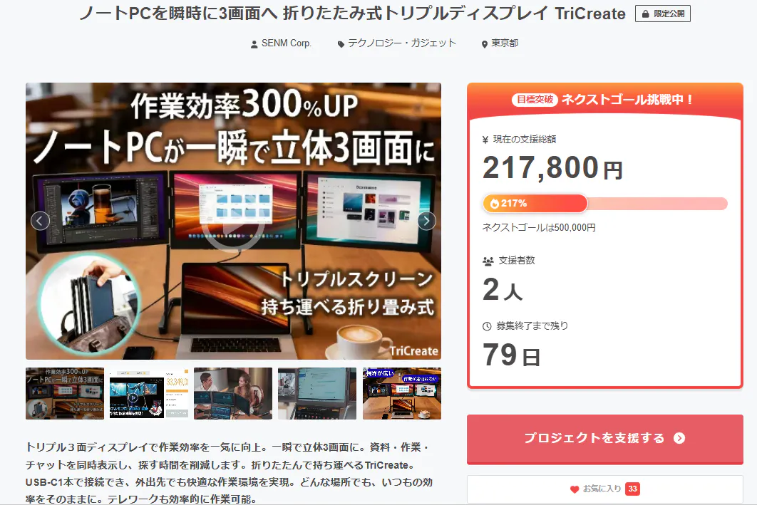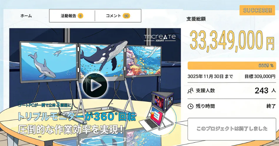 2026/04/03 12:35皆さま、このたびはTriCreateプロジェクトをご覧いただき、そしてご支援・応援いただき誠にありがとうございます。おかげさまで、公開直後に目標金額を達成することができました。温かいご支援をいただき、心より感謝申し上げます。TriCreateは、ノートPCに装着するだけで、瞬時に立体3画面の作業環境を実現できる折りたたみ式トリプルディスプレイです。「資料を見ながら入力したい」「チャットを確認しながら作業したい」「外出先でも会社や自宅と同じように仕事したい」そんな声に応えるために企画した製品です。これから活動報告では、TriCreateの魅力や活用シーン、便利なポイントをひとつずつ丁寧にお伝えしてまいります。引き続き応援のほど、どうぞよろしくお願いいたします。 もっと見る