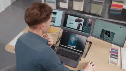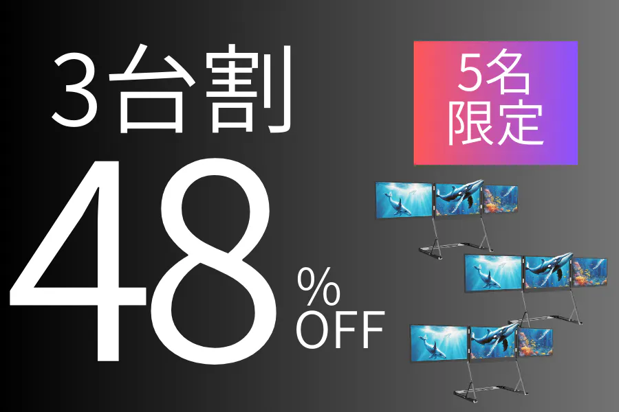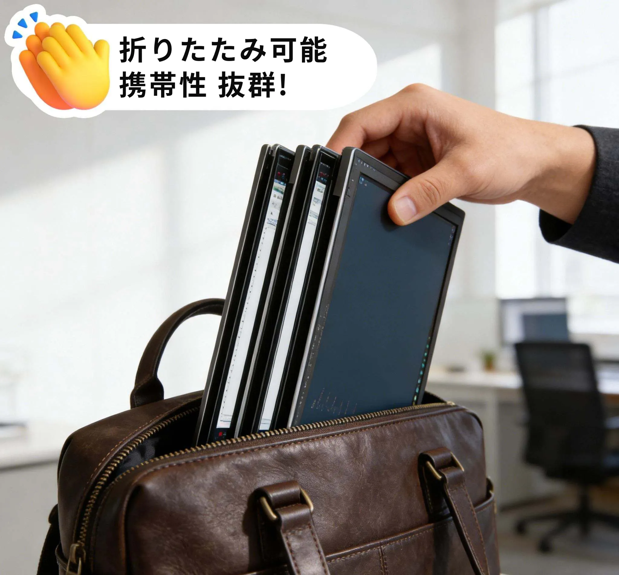 ノートPCに装着するだけで「立体3画面」の作業環境を実現する折りたたみ式ポータブルディスプレイです。