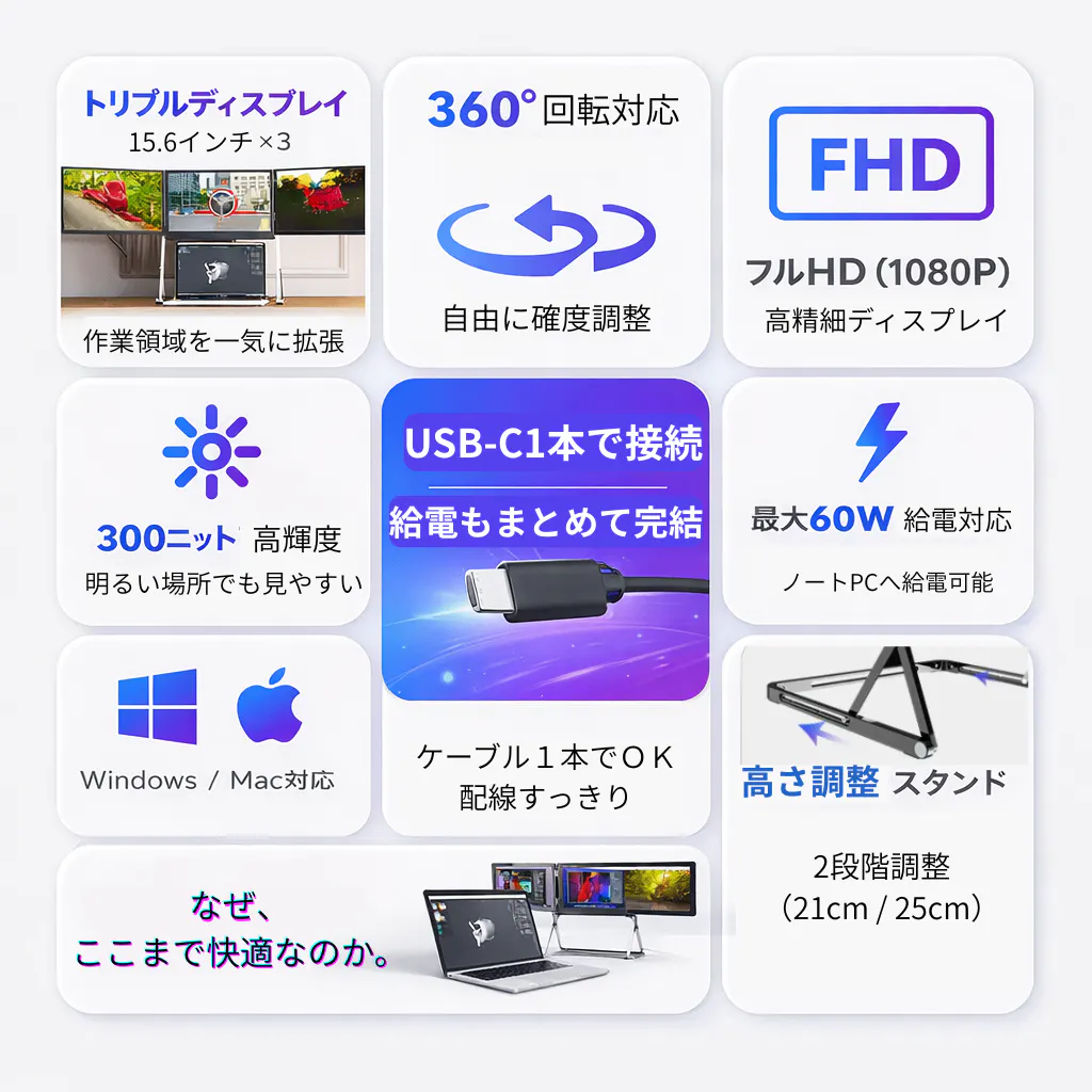 電源と映像をまとめて接続できるため、ケーブルを増やすことなく、すぐにトリプルモニター環境を構築できます。