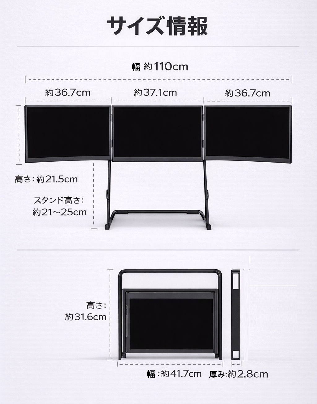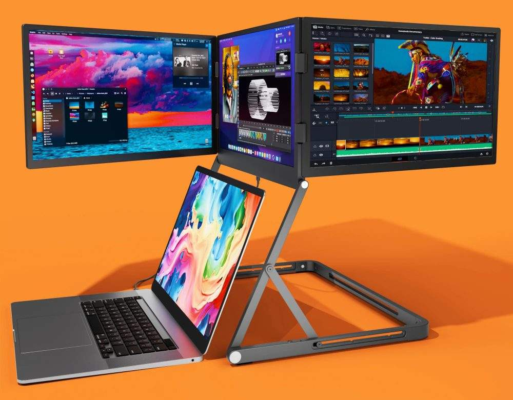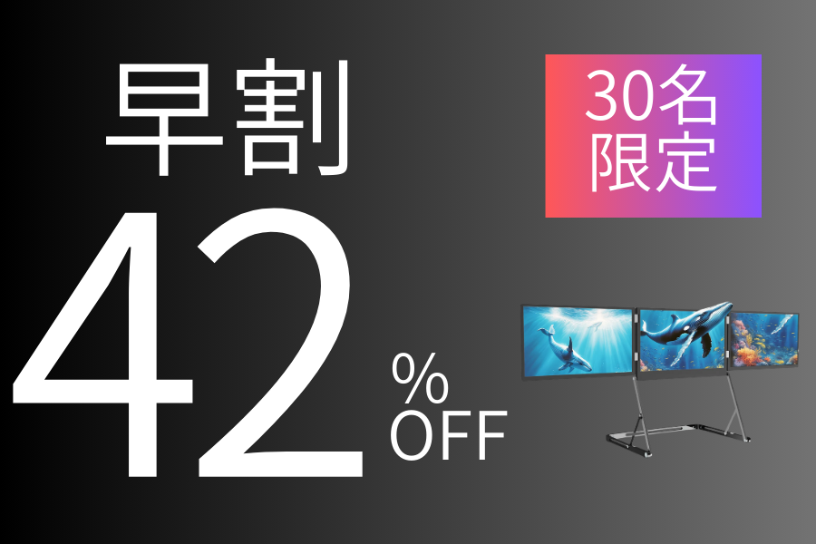 ノートPCに装着するだけで「立体3画面」の作業環境を実現する折りたたみ式ポータブルディスプレイです。
