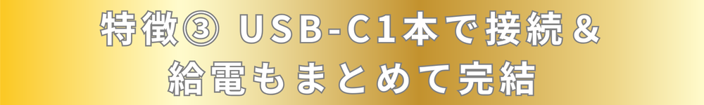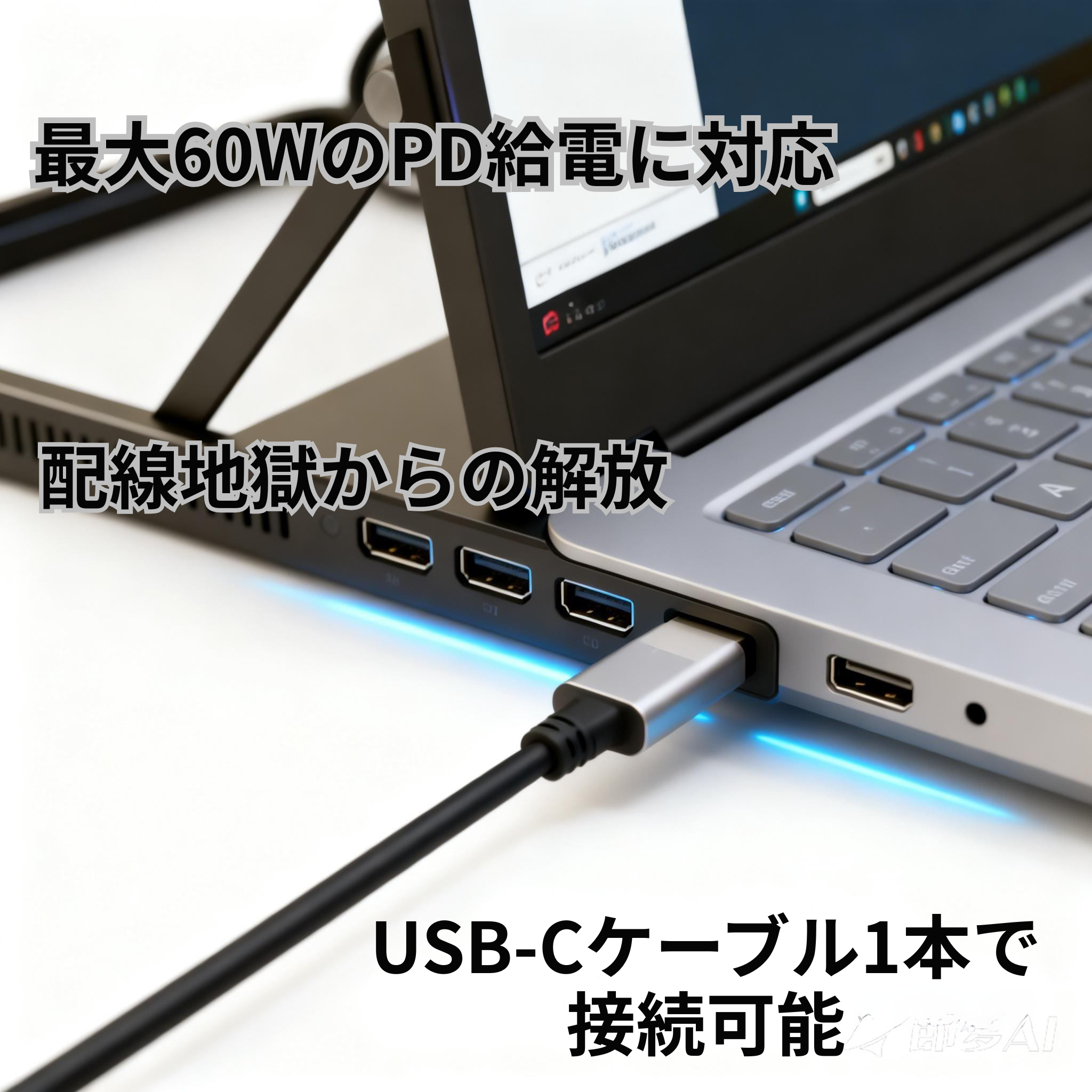 対応PCであれば、USB-Cケーブル1本で接続可能。最大60WのPD給電に対応し、本体からノートPCへの給電も行えます。