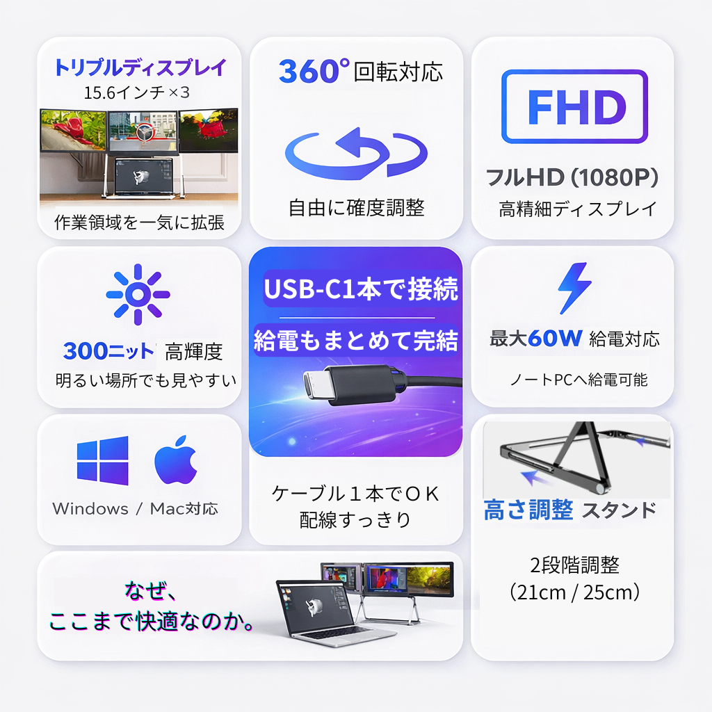 2026/04/08 18:30TriCreateは、対応機種であればUSB-Cケーブル1本で接続可能です。ごちゃごちゃしがちな配線を減らし、スマートに使えるのが魅力です。なお、PC側のUSB-Cポートが映像出力に対応している必要があり、対応していない場合でもHDMIなどで接続可能です。 接続がシンプルだと、設置のハードルも下がります。「使うのが面倒」で結局使わなくなる、ということも起きにくいです。手軽さは、続けやすさ。TriCreateはそこもしっかり考えられています。 もっと見る