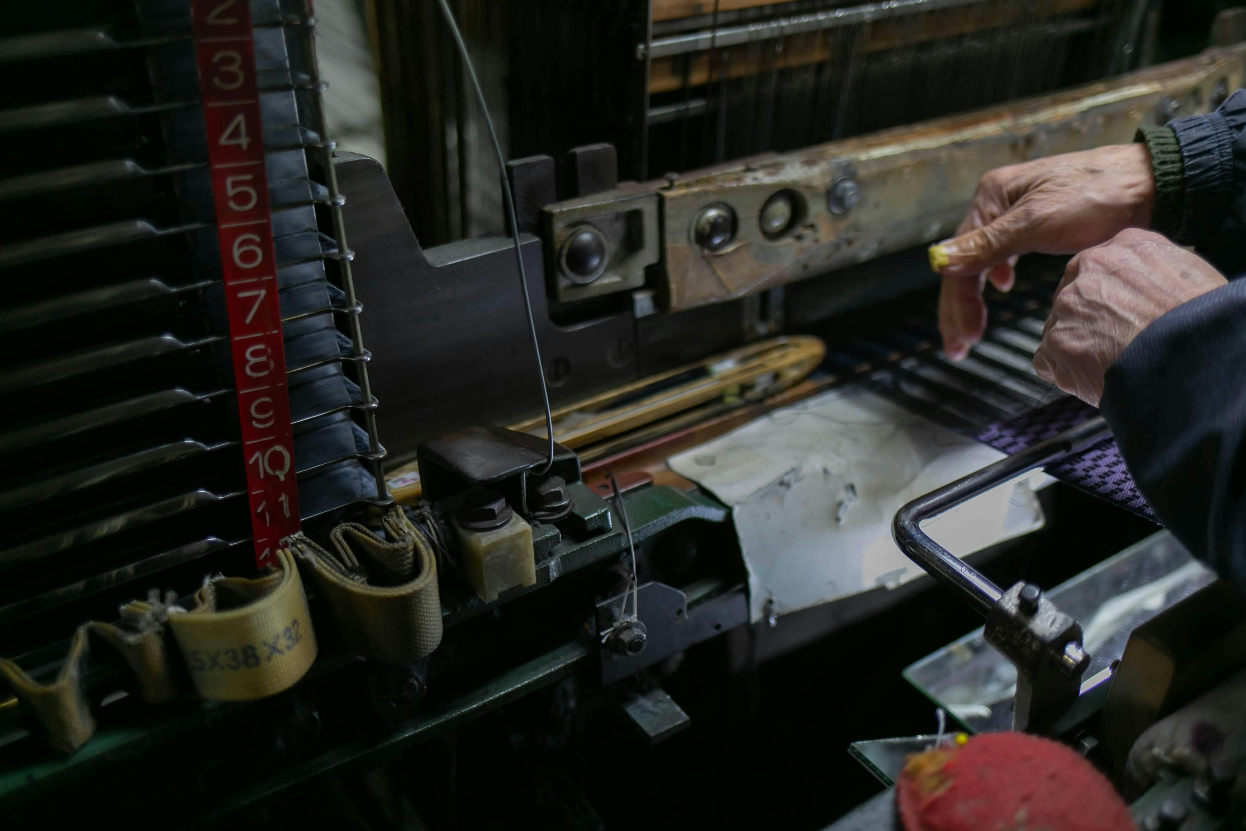 力織機のメーカーは既に廃業しており、新品の部品は手に入りません。しかし、廃業した同業者から譲り受けた機械から使える部品を取り外し取り付けます。