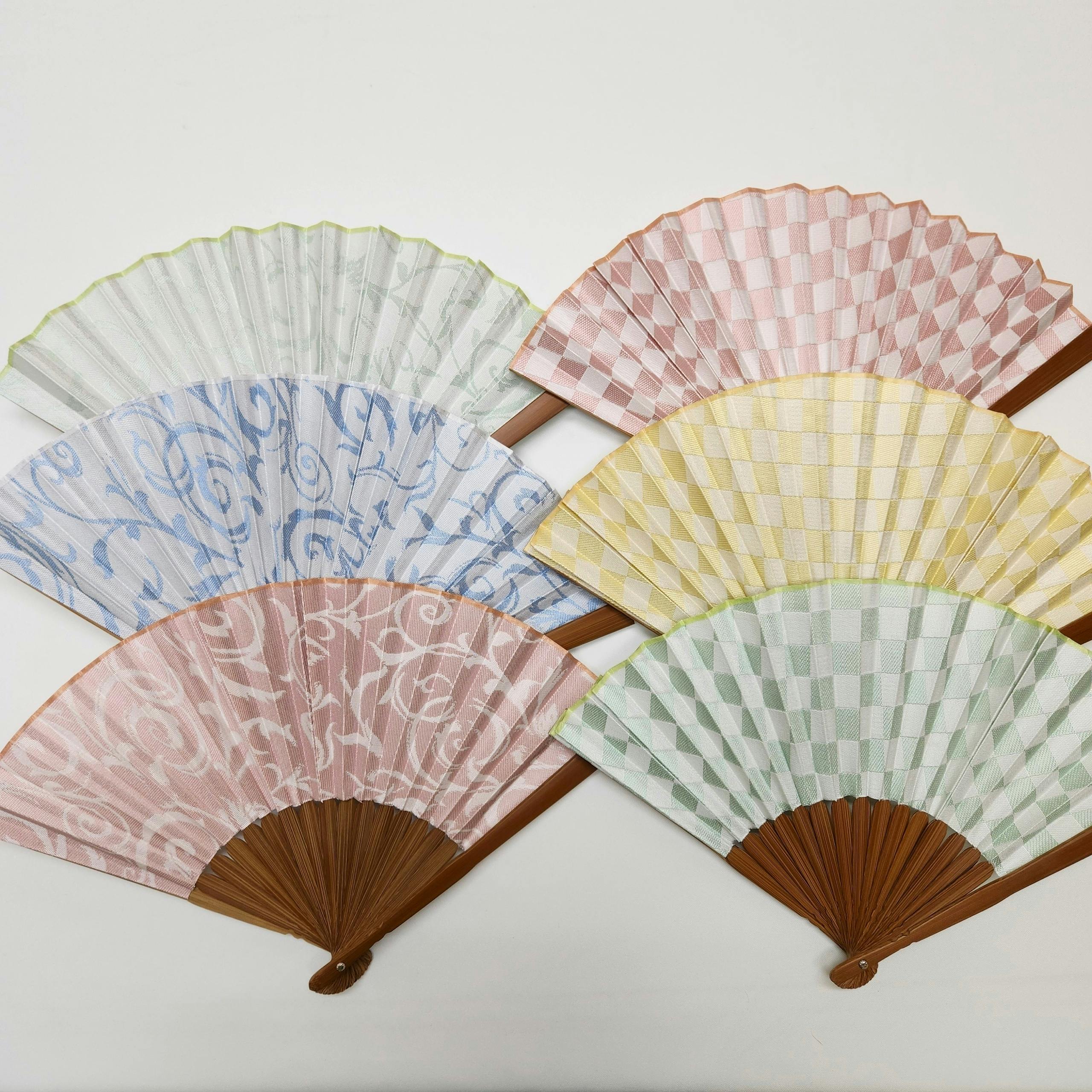 西陣織の生地を扇子にしました。扇いだ時にとてもやさしい風を体感できます。インテリアとしてお家に飾って頂いても素敵です。