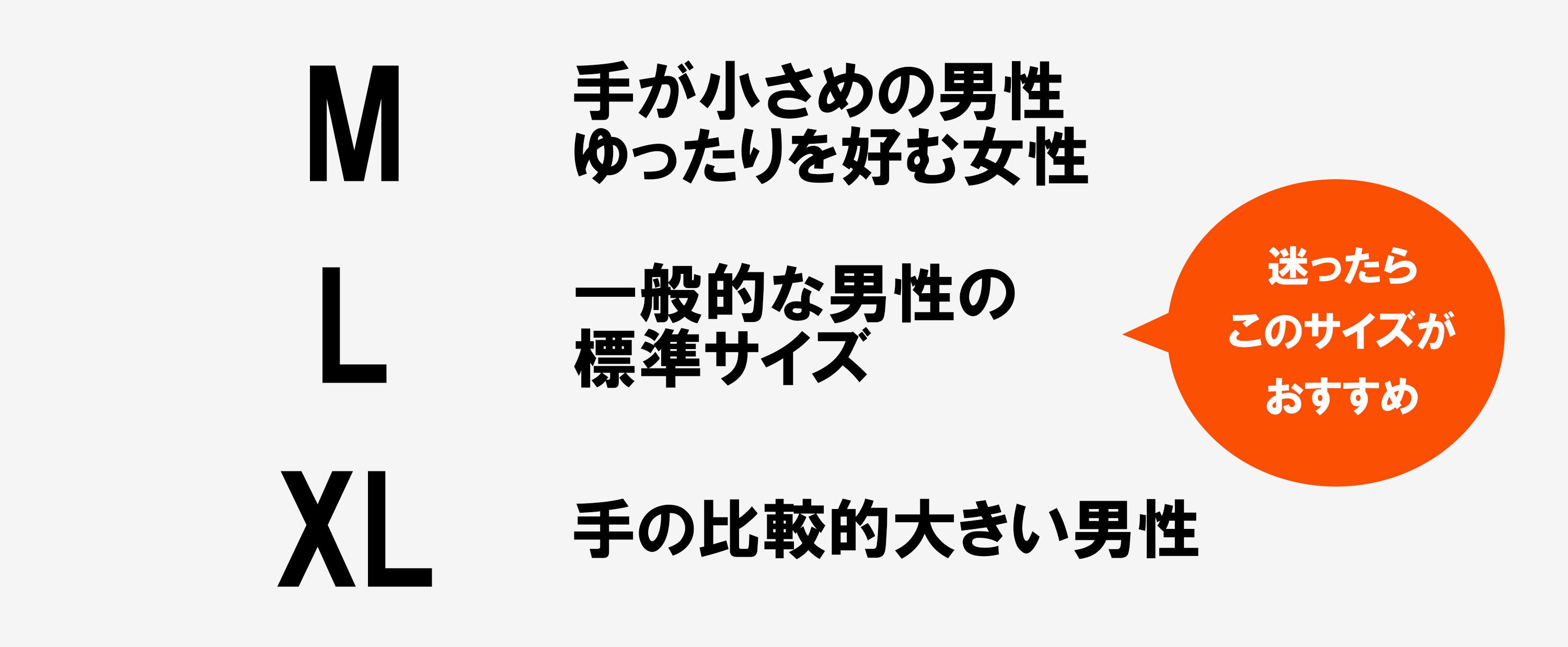 Lサイズは、一般的な男性の手に合いやすい標準サイズです。サイズ選びに迷われた場合は、まず Lサイズ をおすすめします。