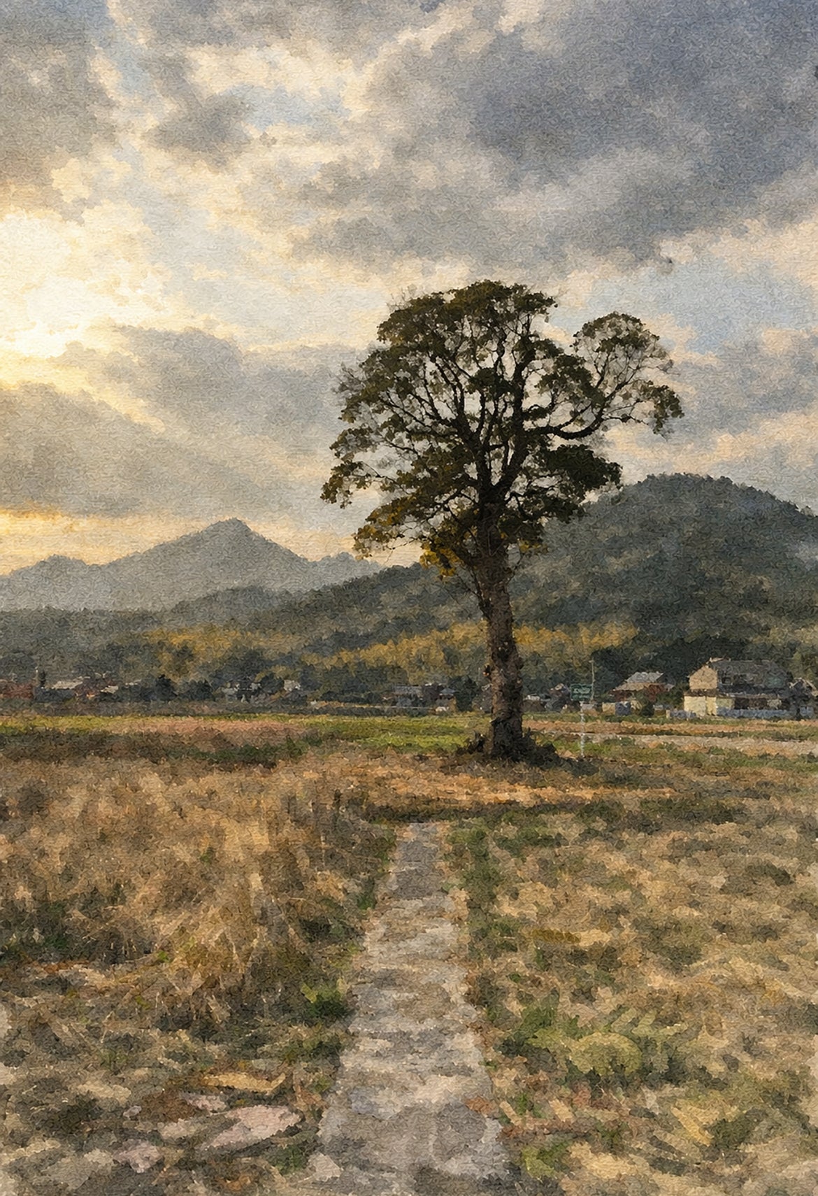 2020年、防府市玉祖神社近くの宮城の杜の風景。今はもうこの光景を見ることはできない。防災用工事でこの木は切られてしまったためだが、これ以外にもまだまだあるだろう。記憶に残す、このイラスト展はそんな意味も込められている。