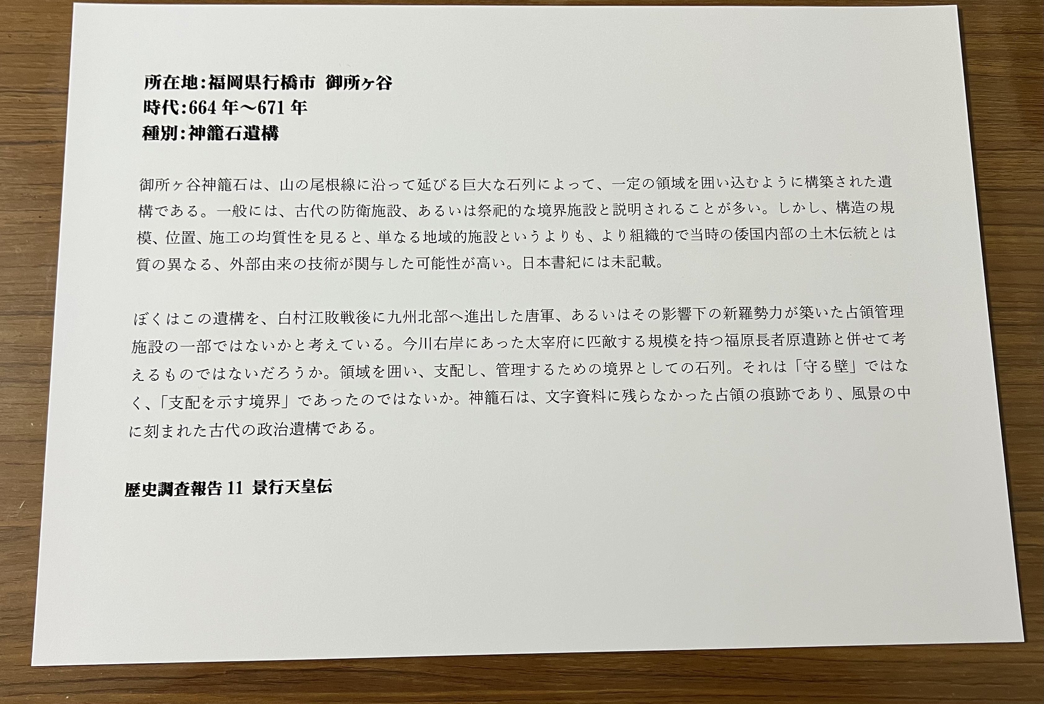 行橋市御所ヶ谷に残る「神籠石」は、山の尾根線に沿って巨大な石列が延び、一定の領域を囲い込むように築かれた遺構です。一般には古代の防衛施設、あるいは祭祀的な境界と説明されますが、その規模と構造は、当時の在地技術だけでは説明しきれない部分も残しています。私はこの神籠石を、白村江の戦い後に九州北部へ進出した唐・新羅勢力、あるいはその影響下で築かれた「占領管理の境界」であった可能性があると考えています。守るための壁ではなく、支配と管理を示すための境界だったのではないか――。神籠石は、文字資料には残らなかった占領の痕跡であり、風景の中に刻まれた古代の政治の記憶です。この展示と記録は、その見えない歴史を、もう一度私たちの前に呼び戻す試みでもあります。