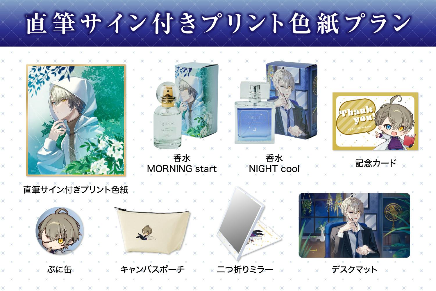 直筆サイン付きプリント色紙、香水2種、グッズが手に入るプランです♪