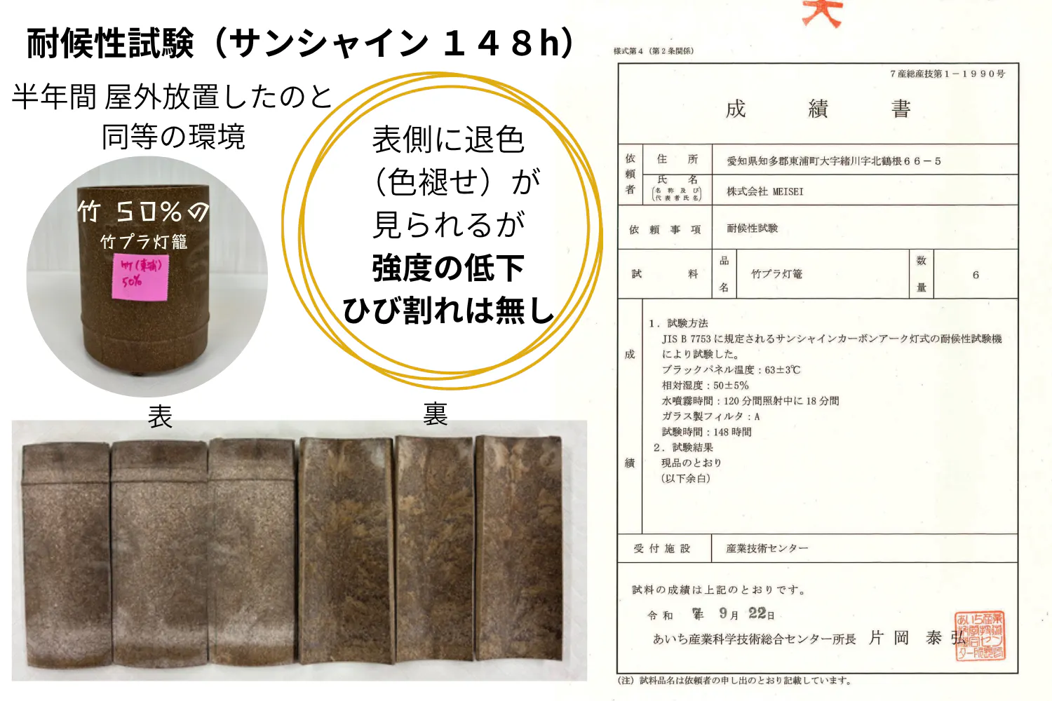 製品の品質については、公的機関による過酷な耐候性試験を実施し、半年間の屋外放置相当の負荷をかけても強度の低下やひび割れが一切起きないことを実証しました 。