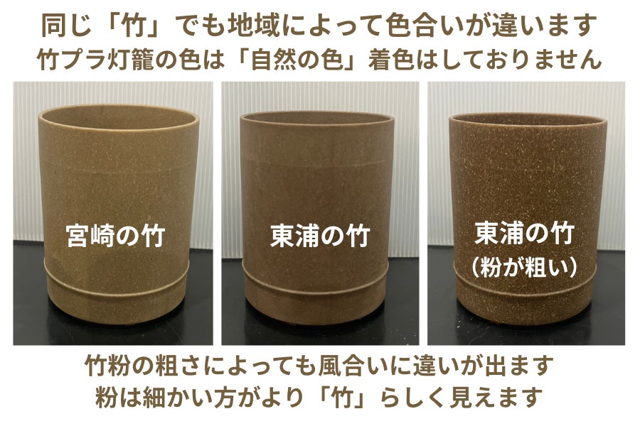 私たちが作っている竹プラ灯籠は主に「プレニード製法」を用いており、同じ竹の含有量でも、竹のつぶつぶ感が少なく竹のように滑らかな風合いに仕上がっています。