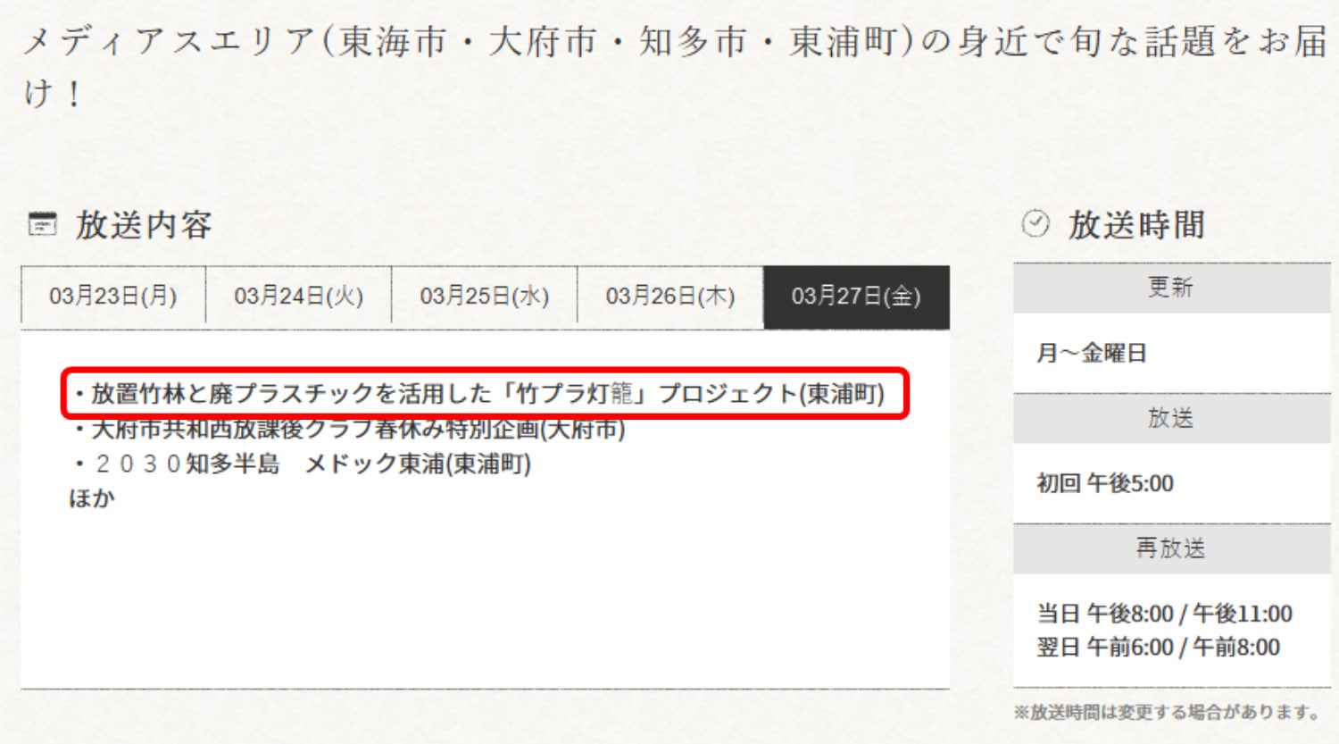 明日(3/27)17:00~ medias エリアニュースの中で放送