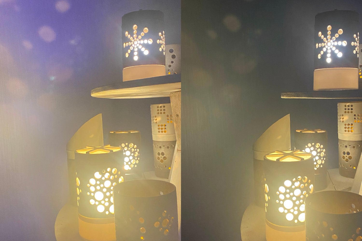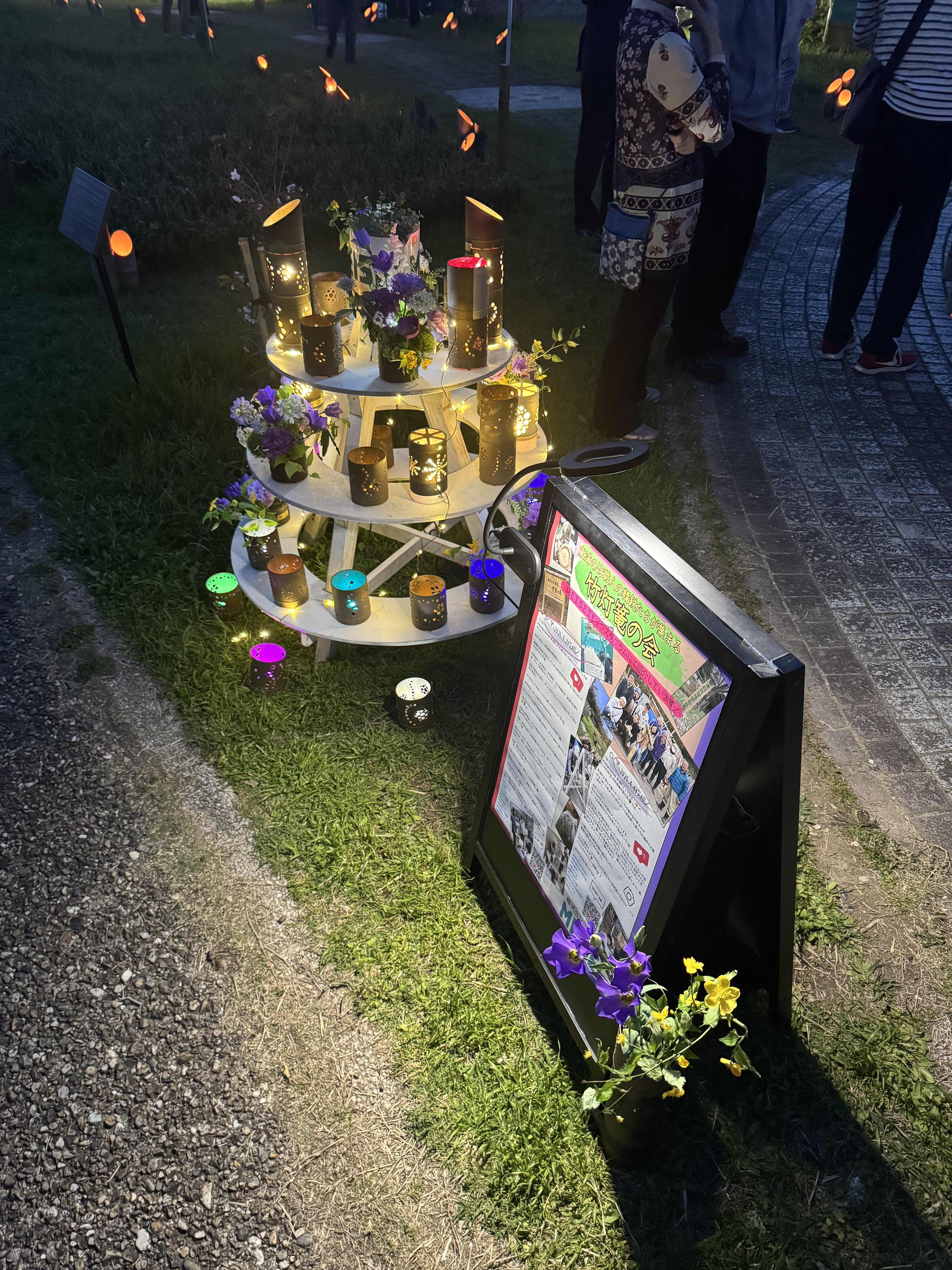 色とりどりの竹灯籠が立ち並ぶ一角に「カラフルな灯りを灯す竹プラ灯籠」と「花瓶のように花を飾る竹プラ灯籠」を3段の円台に並べ、宵祭りに色を添えさせていただきました。