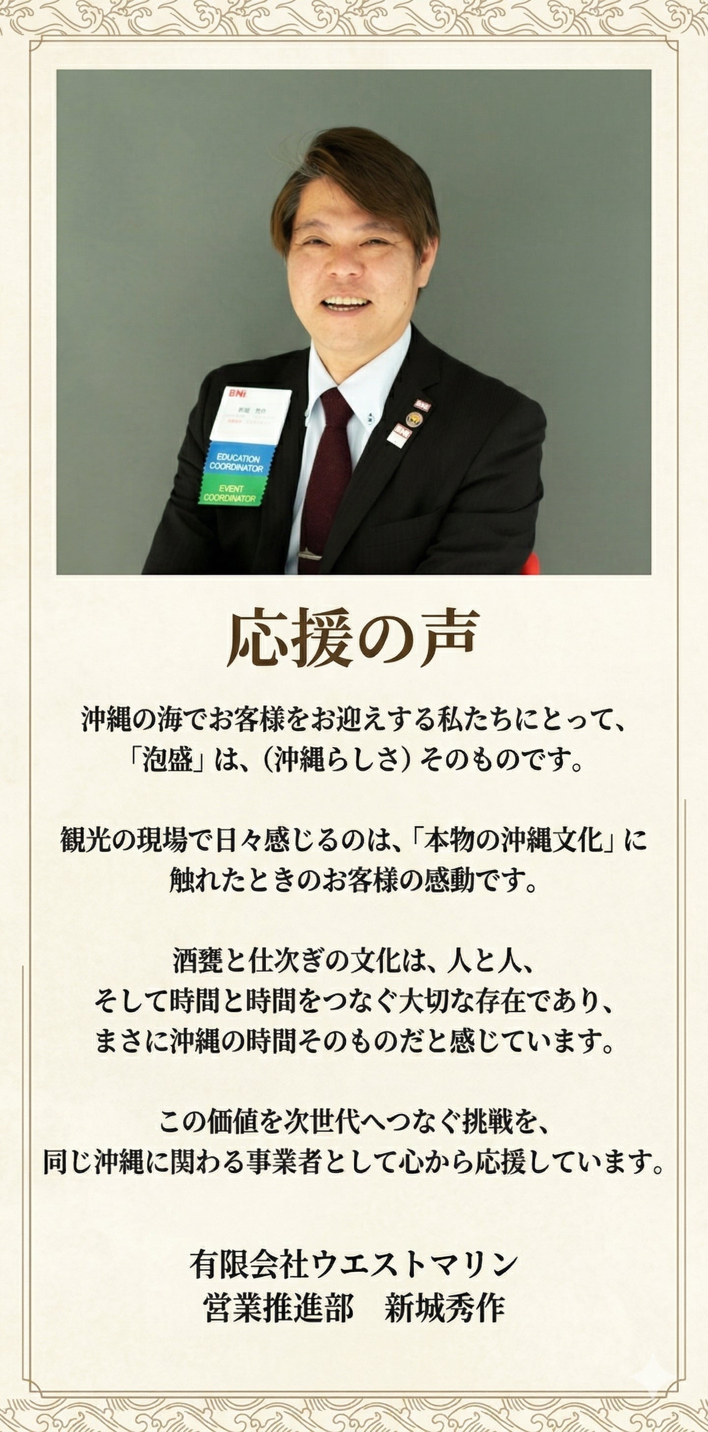 それは狙って生まれた表情ではなく、 沖縄の空気の中で重ねてきた時間が、 自然と滲み出たものなのだと思っています。