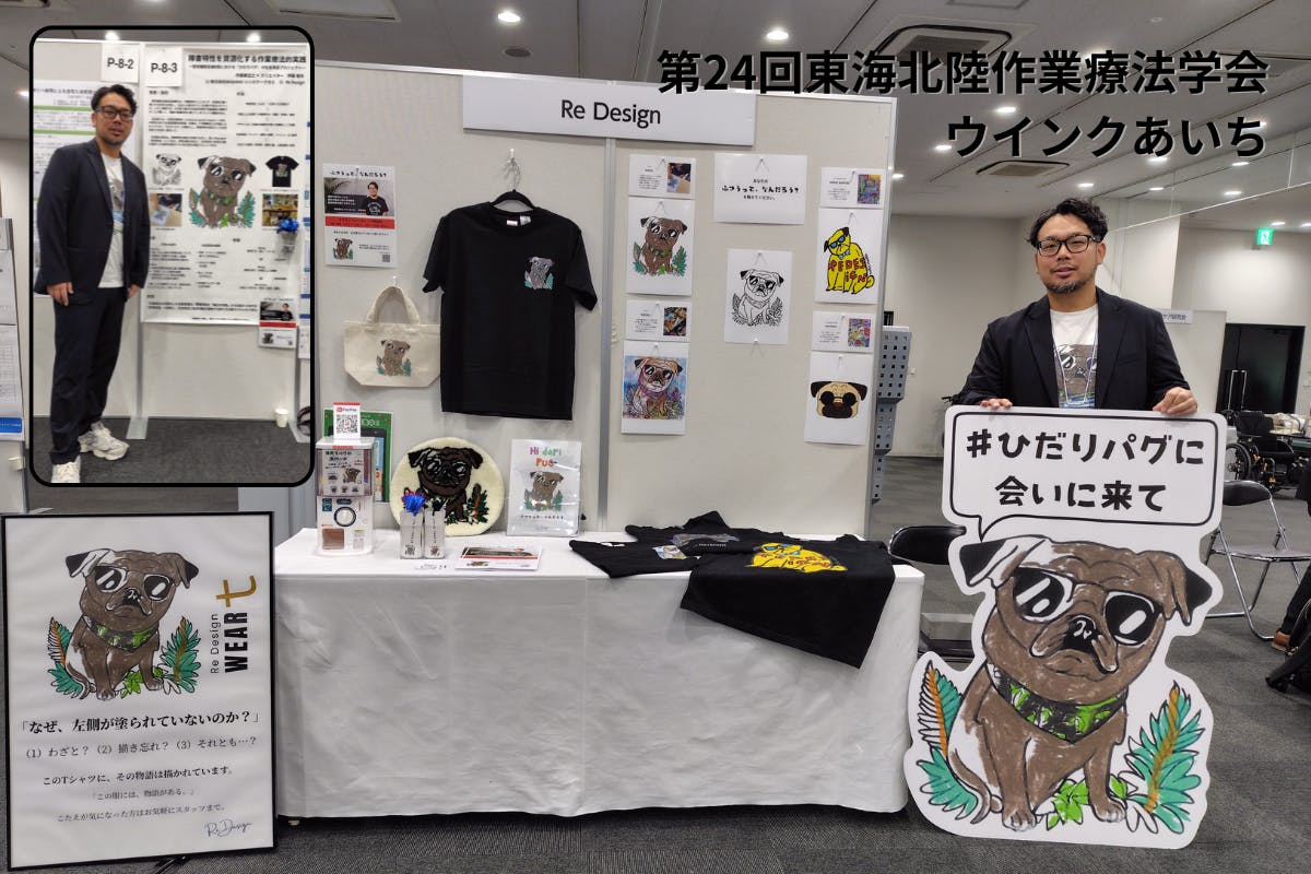 会場では、研究発表に加えてひだりパグの原画・Tシャツやバッグなどのプロダクト・制作背景や実践事例を実物として展示し、多くの作業療法士や教育関係者、医療福祉関連の企業の方に足を止めていただきました。