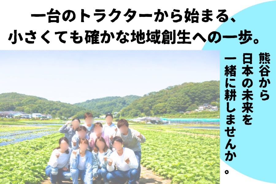 熊谷という農業に適した地域で、まずは小さく始め、続けること。その象徴が、今回募集するトラクター1台です。