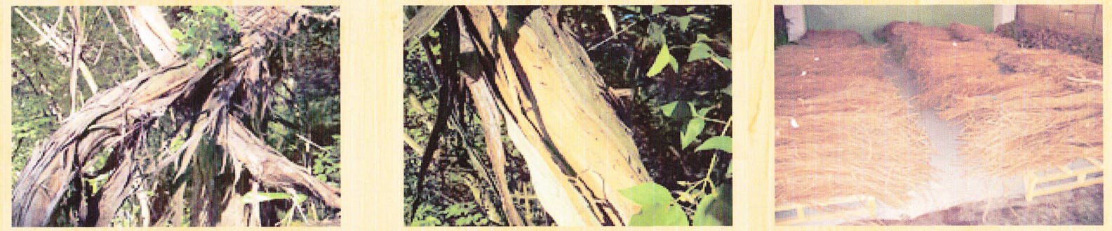 山葡萄は人里離れた標高1000m以上の山奥で昔から寒冷地に自生する植物です。その為蔓の採取も大変な時間と労力を必要とする作業工程のひとつであります。日本でも海外(中国)でも採取できる環境は同じ条件下で自生する植物なので、素材そのものは国産、海外産に差異はありません。蔓といっても太いもので10cm以上にもなります。蔓を剥ぎ取り乾燥させて、籠の材料となるようサイズを整えてゆきます。