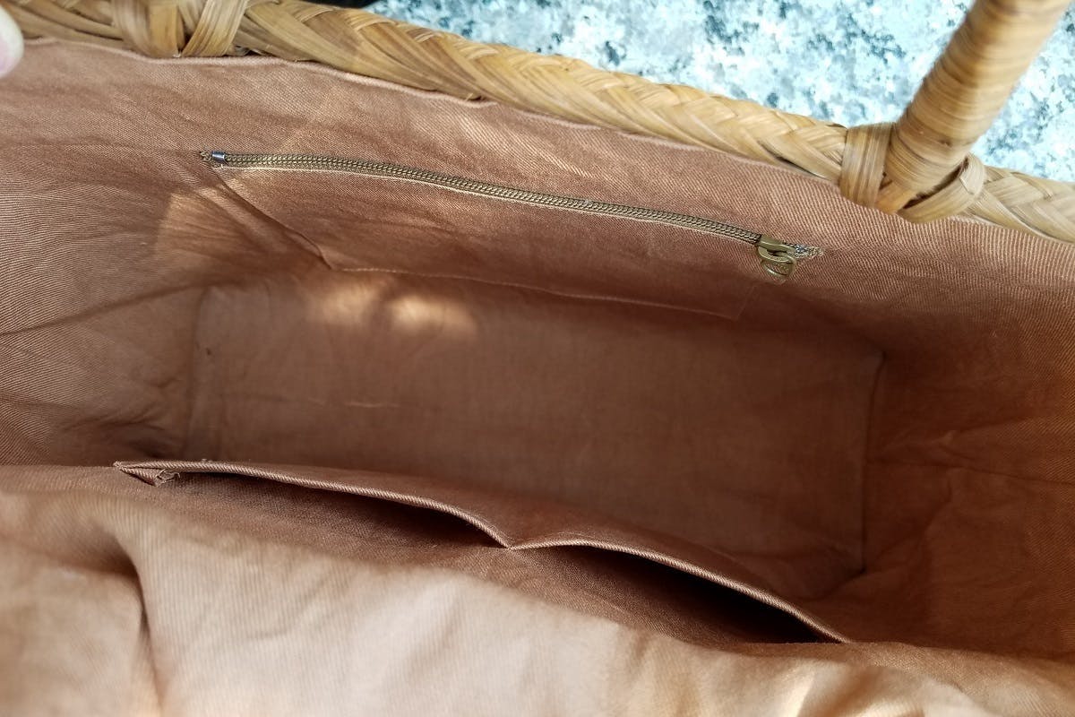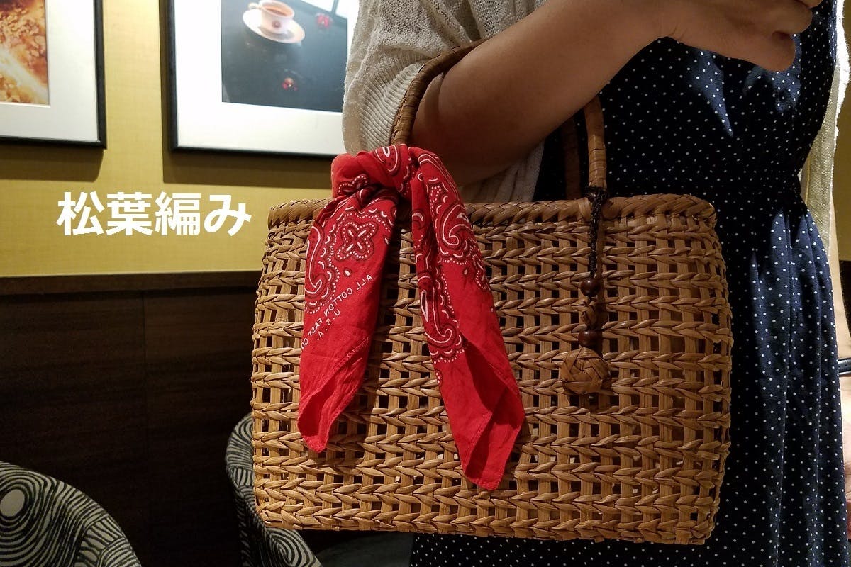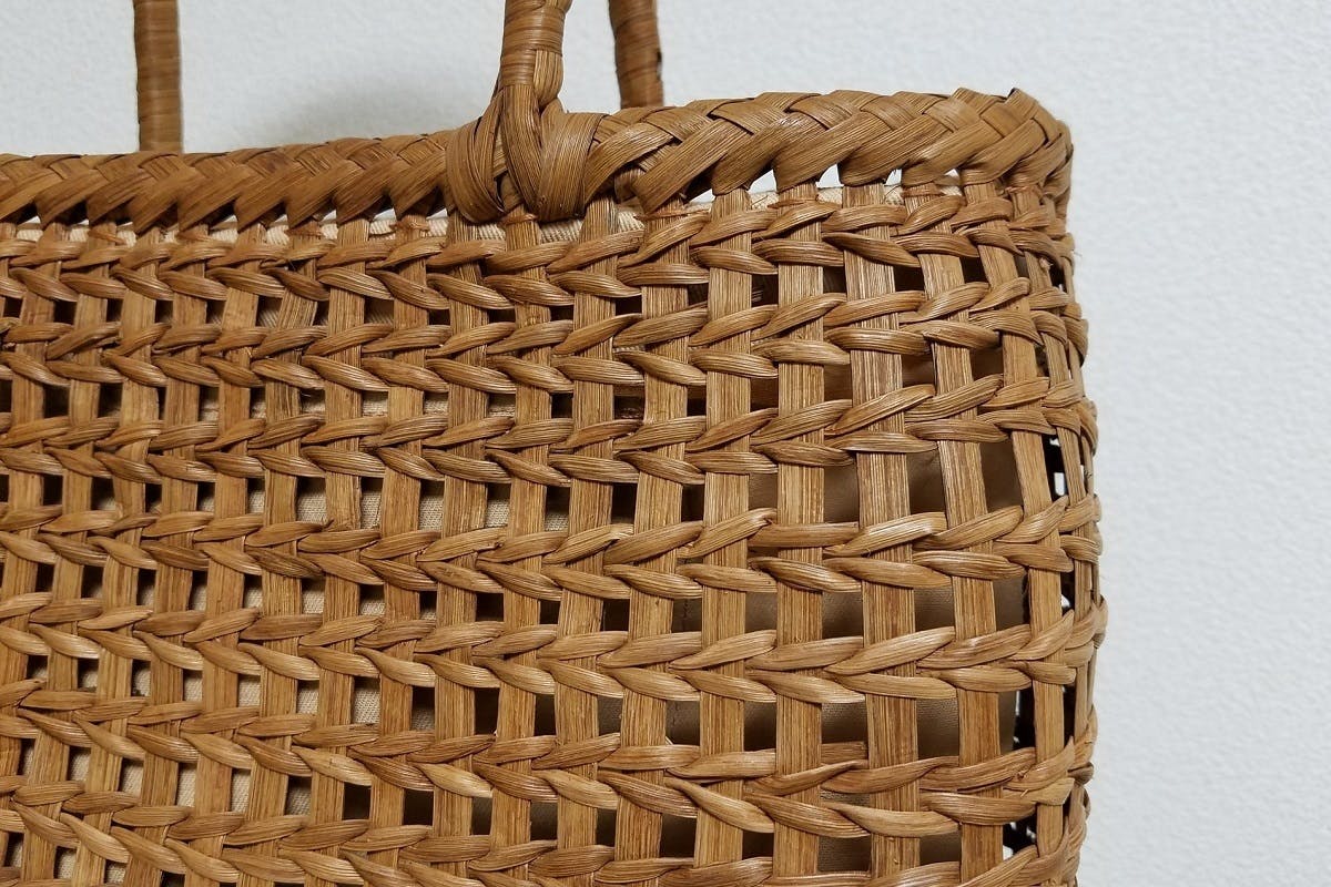 松の葉を一本一本イメージして編み込んでいることで、柿渋染めの内布が編み目の隙間から透けて見えるのが松葉編みの特徴です。そのデザインからA4ファイルが入るサイズの山葡萄籠バッグの中では最も軽くしなやかです。