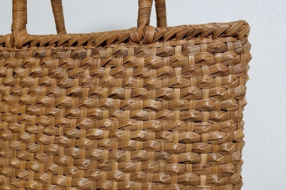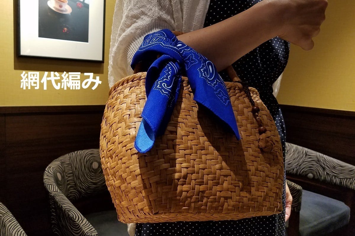 編み方は定番の網代形に交差させる編み方ですが、製品全体のフォルムが丸みを帯びたデザインの為、和装洋装問わずどのような装いにも合わせやすいデザインが特徴。長年定番人気商品となっています。