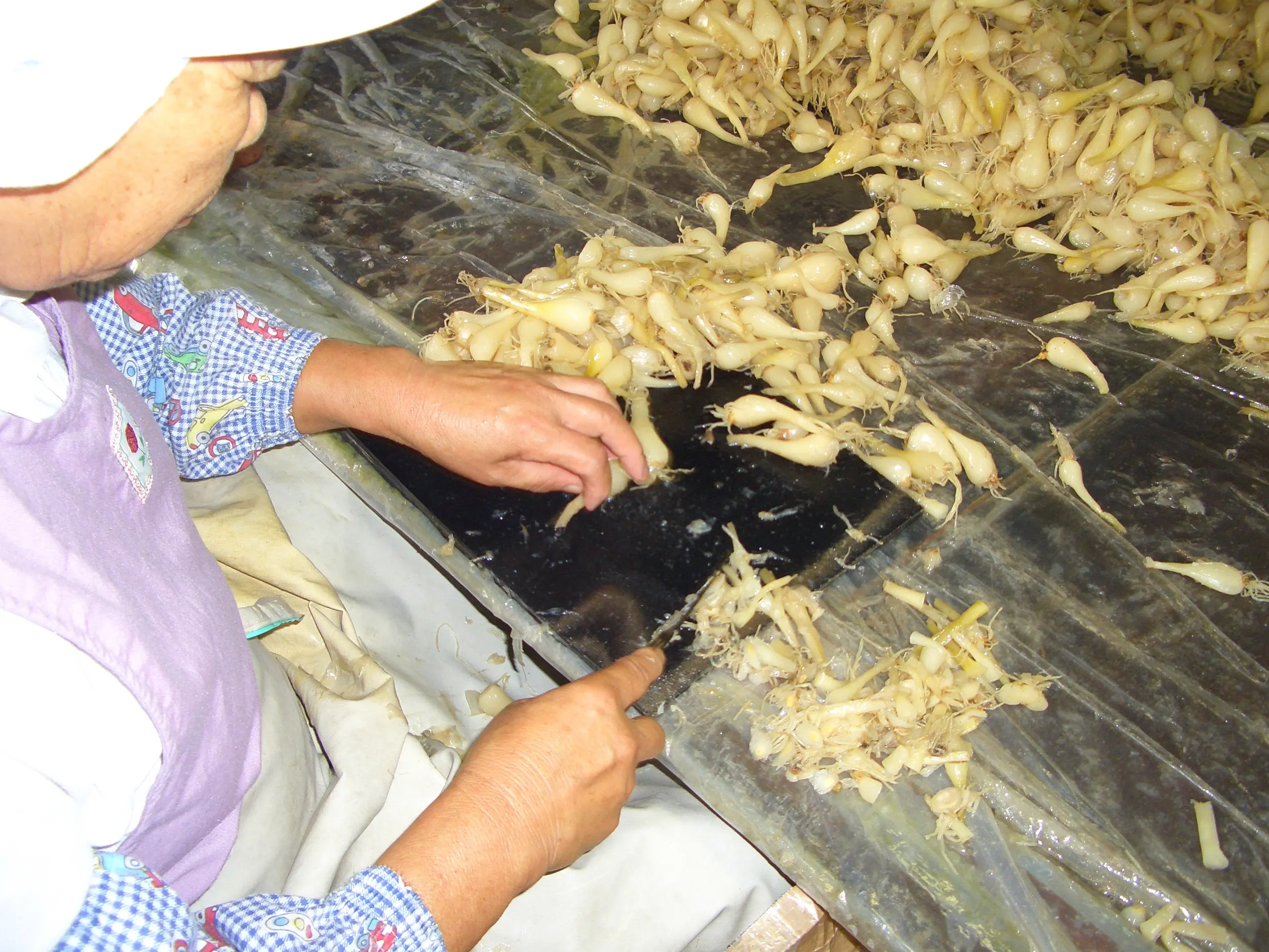 らっきょうの根と茎にはらっきょうフルクタンが入ってないので、根と茎を手作業で切り落としていきます。70代から80代のおばあちゃん達が真心こめて作業をしていただいています。この作業を国内で行っている会社はほんの数社、ほとんどが東南アジアで理由は安いからだそうです、私たちは地域にお金を落とすことを選んでおります。