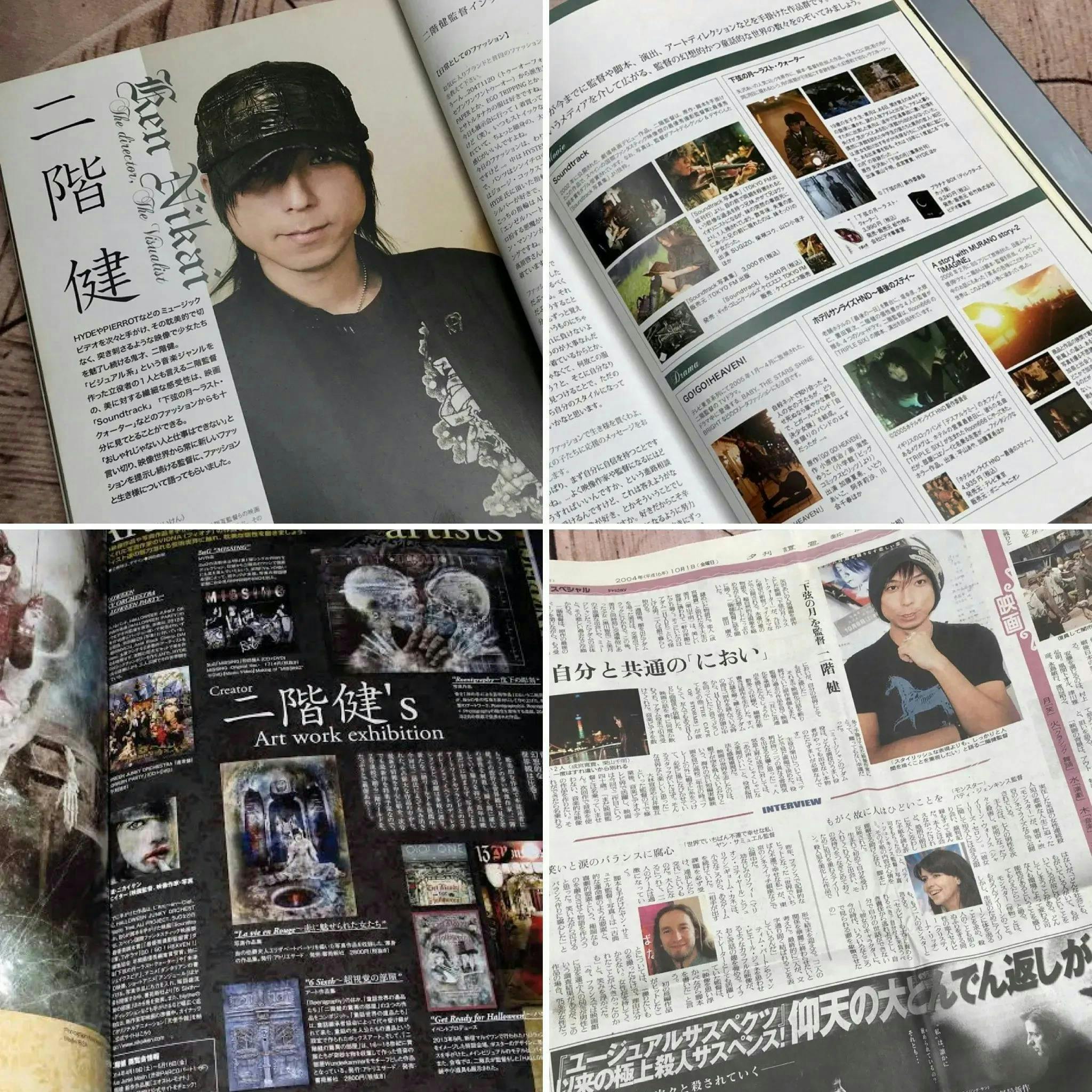 劇場映画デビュー作「Soundtrack」(柴咲コウ・SUGIZO主演)では自ら脚本を手がけ、第12回セマナ(スペイン)国際ファンタスティック映画祭において、その独創的な世界観が賞賛を浴び「最優秀脚本賞」「最優秀撮影監督賞」をW受賞。その後、松竹全国公開「下弦の月~ラスト・クォーター」(矢沢あい原作 栗山千明、成宮寛貴)、映画「ファンタスマゴリー」(小川紗良・HYDE・永瀬正敏)、TVドラマ「GO ! GO !HEAVEN !」(編集協会 最優秀タイトルバック賞)、AAA主演「未来世紀シェイクスピア」、「演技者 REDRUM」(フジテレビ優秀照明賞)、ベルギーの絵本作家 G・バンサンの世界的ベストセラー絵本「アンジュール」初のオフィシャルアニメーション化(音楽 坂本龍一)、L’Arc~en~Ciel、 HYDE、VAMPS、Halloween Junky Orchestraなどの人気バンドのミュージックビデオや、新宿マルイのハロウィンイベント「Get Ready for Halloween!」の全館プロデュース、アトリエサードより写真作品集「Dead Hours Museum〜午前三時の美術館」他9册を刊行。 https://ja.wikipedia.org/wiki/二階健