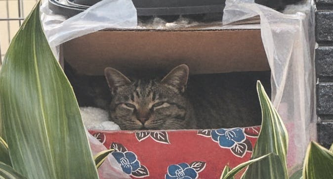 外をそっと覗くと、私が手作りしたダンボールのお家の中に入り、