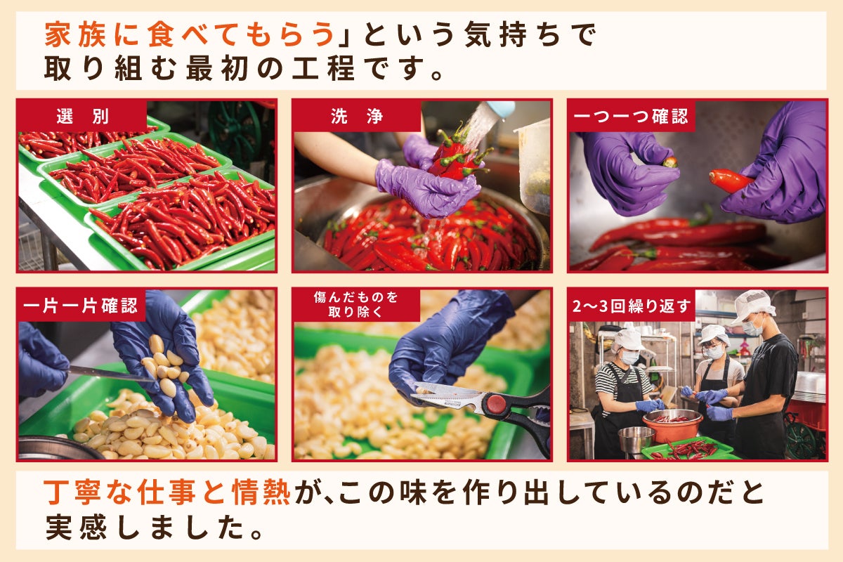 そこにあったのは、機械化された工場ではなく、徹底的な「手作業」の現場でした。唐辛子やにんにくを一つひとつ手で選別し、傷んだものを取り除く。洗浄を何度も繰り返し、余分な水分を拭き取る。「家族に食べさせるものだから、素材選びには一切妥協しない」そんな生産者の実直な想いと、惜しみない手間暇が、この瓶には詰まっています。