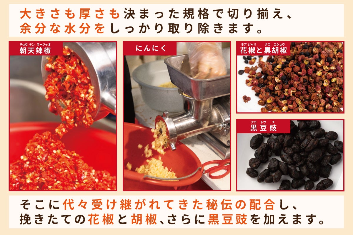 ・原材料:唐辛子、食用大豆油、にんにく、黒豆鼓、花椒、フライドガーリック、白胡椒、食塩、砂糖/クエン酸、甘味料(アセスルファムK、グリチルリチン酸Na)、(一部に小麦・大豆を含む)
