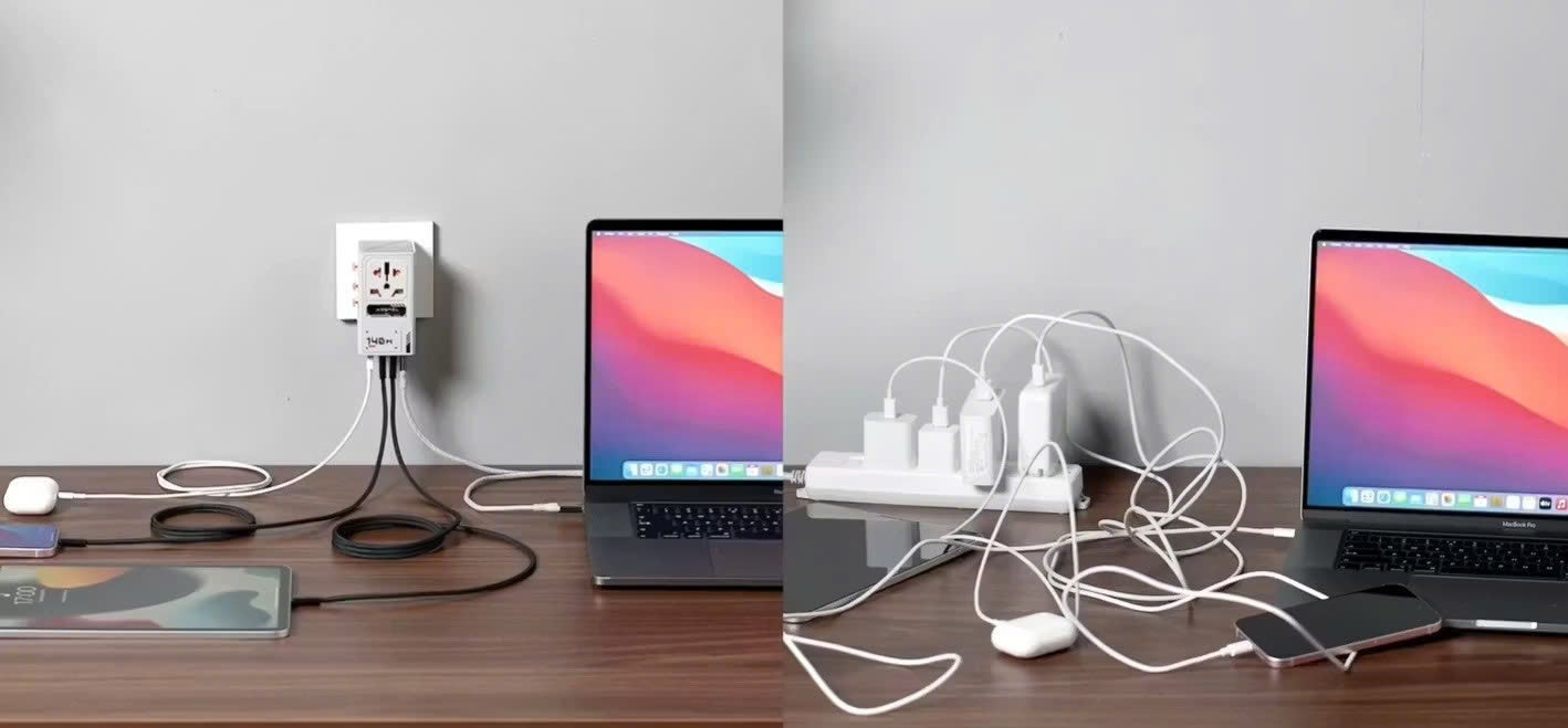 VisaPro 170Wは、ダブルヒューズ仕様と高出力USB Type-Cポートを搭載し、安全性と機能性の両方を兼ね備えた充電ステーションです。過負荷時には自動で電力を遮断し、事故を防止するため、安心して使用することができます。さらに、最大140Wの高出力ポートにより、MacBookやノートパソコンなどの消費電力の高いデバイスも充電でき、旅行や出張の際にも非常に便利です。
