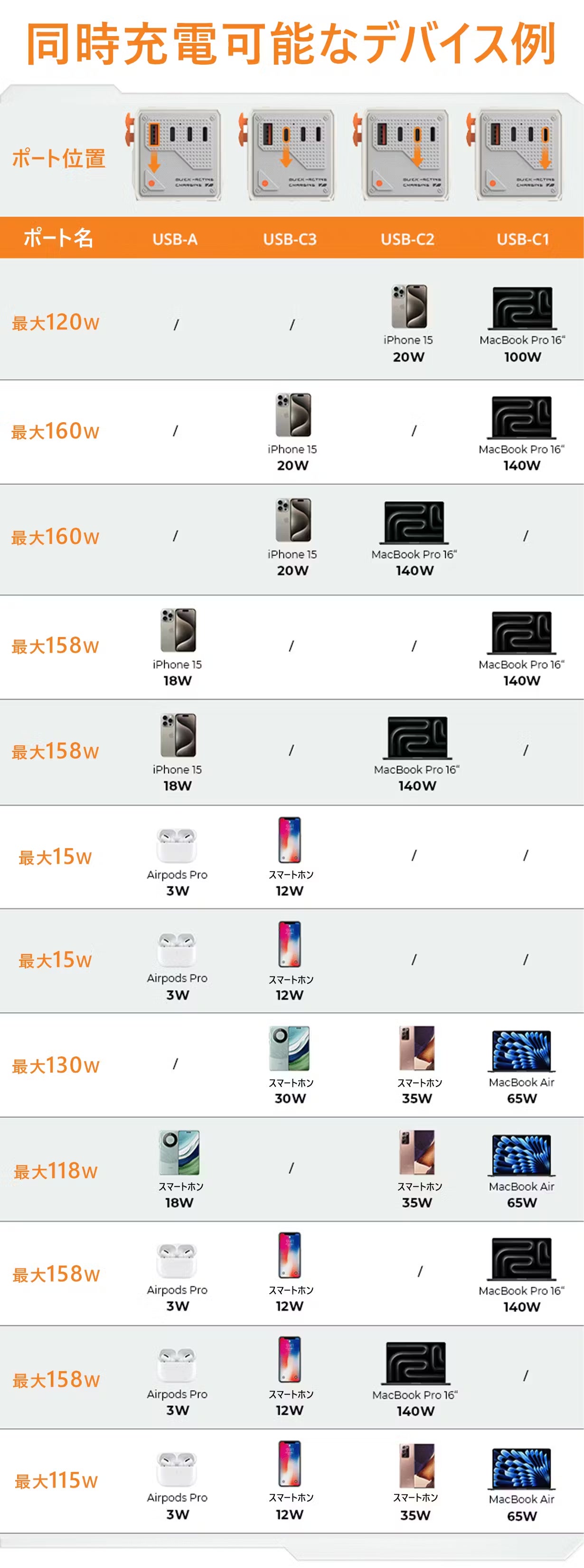 USB Type-Cポートは、特にノートパソコンやタブレットなどのデバイスを充電する際に便利で、高出力対応のこれらのポートを使えば、大きなデバイスでも充電がスムーズです。さらに、最大140Wの出力により、大容量バッテリーを持つデバイスにも十分な電力を供給することができるため、外出先でもPCやタブレットのバッテリーを素早く補充できます。