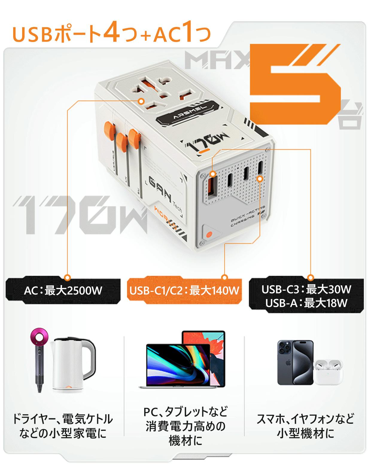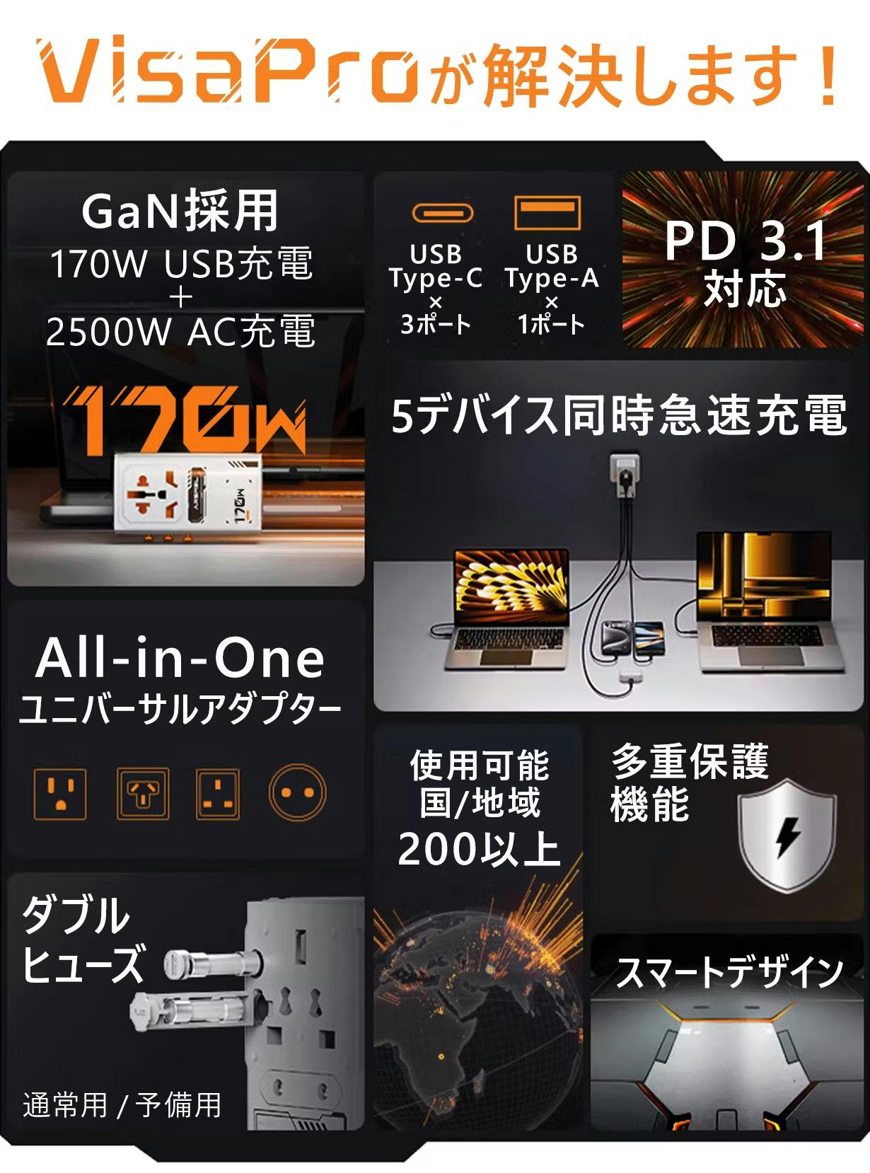 複数の充電器やケーブルが絡まり、机の上はごちゃごちゃしています。しかし、VisaPro 170Wを使うと、たった一台で5台同時充電が可能になり、デスク周りが驚くほどスッキリします。この変換プラグは、USB Type-Cポート3つ、USB Type-Aポート1つ、さらにACポートも搭載しており、ラップトップやスマートフォン、タブレット、イヤフォンまで、あらゆるデバイスを同時に充電できます。