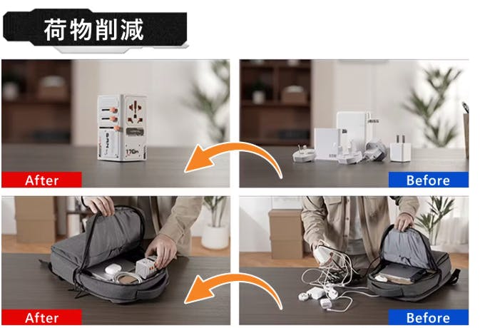 次に荷物に注目してみましょう。各デバイスごとに異なる充電器を持ち歩いています。これではバッグの中がすぐにいっぱいになってしまい、重くてかさばる原因になります。しかし、VisaPro 170Wがあれば、荷物が大幅に削減され、バッグの中も整理整頓できます。このコンパクトなデバイス1つで、複数のデバイスの充電が可能なため、軽量化を図りたい旅行者や出張者にとって必須のアイテムです。