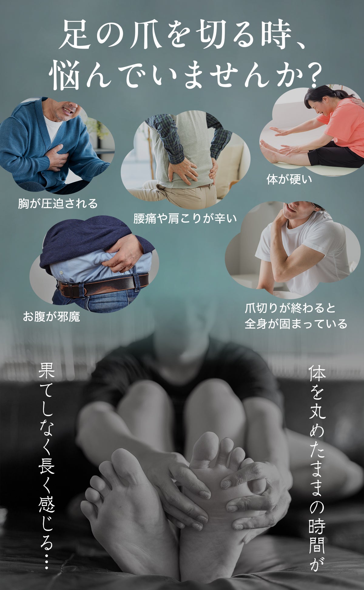 もし大切な人が足の爪切りで辛い思いをしていたら、体をかがめない贅沢と手を伸ばさない快適さをプレゼントして下さい。