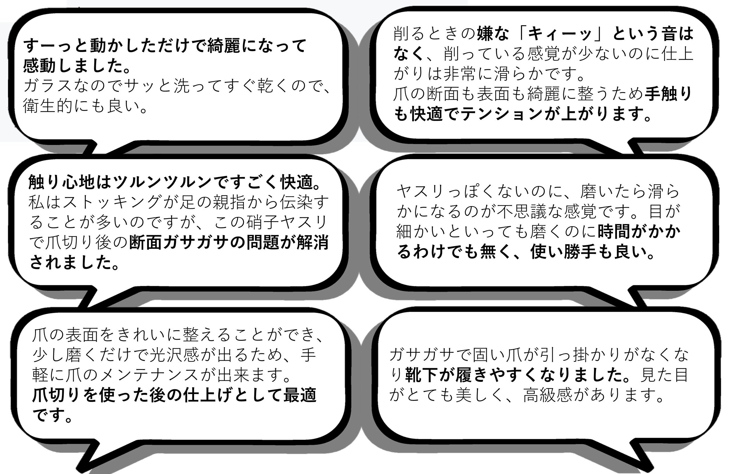 よくある金属製のヤスリや爪切りの裏側についてるギザギザ部分とは全く違う、ガラス製のヤスリです。この硝子ヤスリは切った後の爪の断面だけでなく、爪の表面までも艶々に磨き上げてくれます。