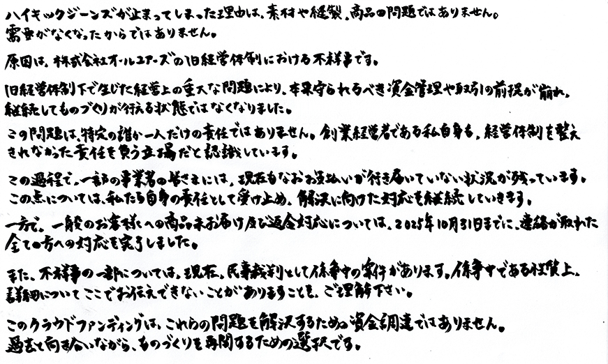 過去の経緯をお伝えしたうえで、それでも「ハイキックジーンズが欲しい」という声をいただき、その期待にどうしても応えたいと思ったこと。